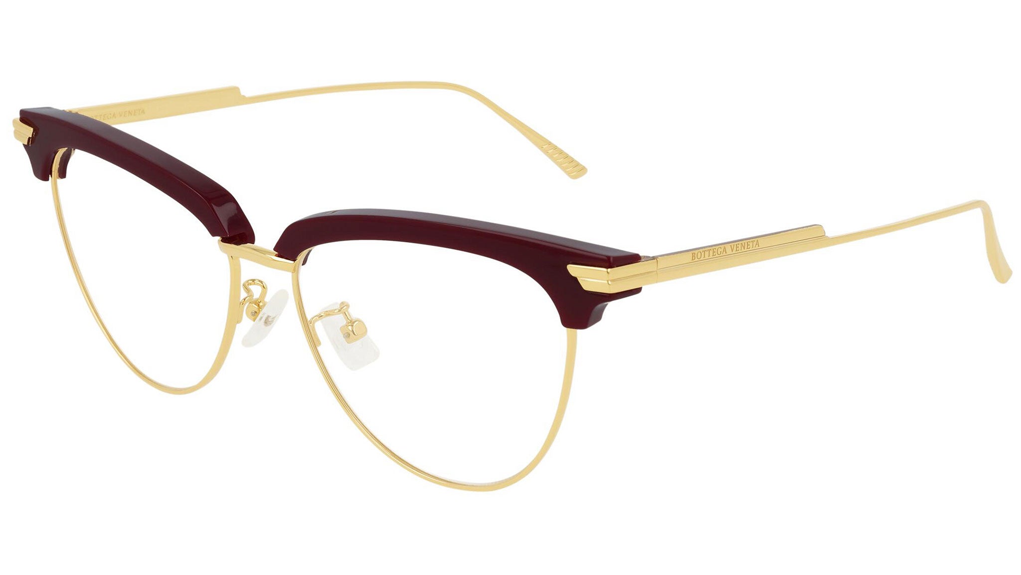 Occhiali da vista Bottega Veneta linea New classic variante colore 003 bordeaux tinta unita lucido e oro lucido con astine color oro.