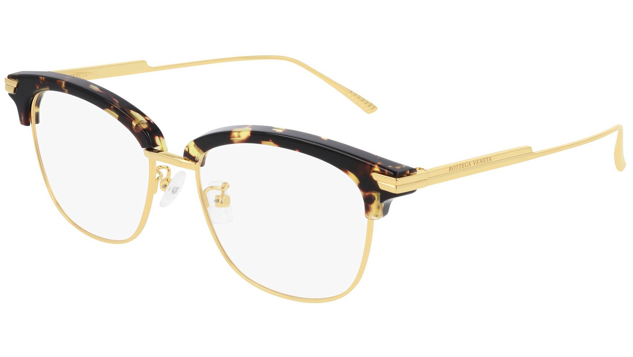 Occhiali da vista Bottega Veneta modello BV1011OA 003 featuring shiny spotted havana / shiny gold frame and gold temple.