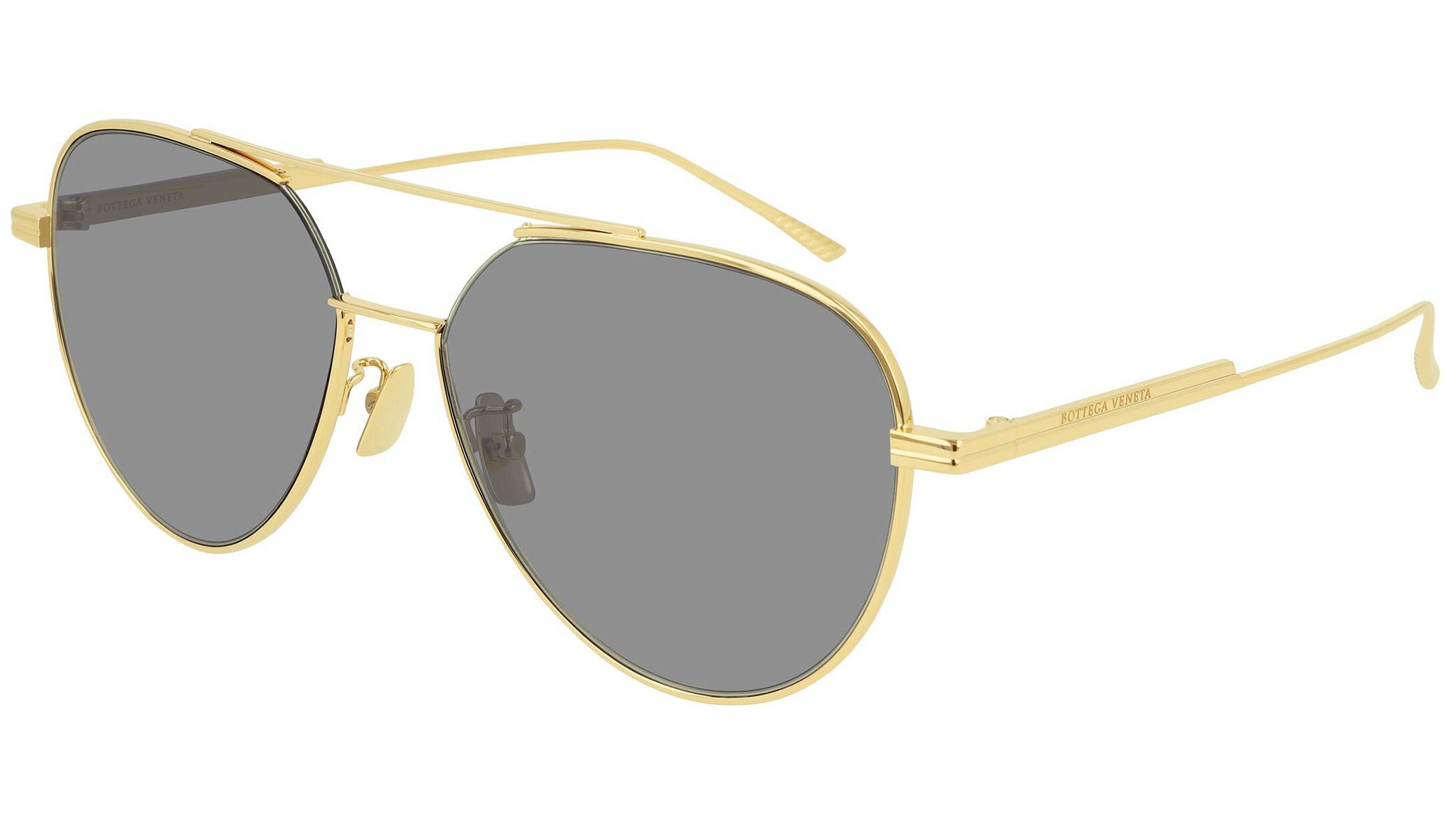 Bottega Veneta sunglasses collection model BV1013SK 012 featuring shiny gold lv frame and solid light grey - co-branding zeiss lens. Inspired by Italian culture with a global outlook, the House is defined by a distinctly refined attitude. Bottega Veneta uses noble materials to create considered pieces that become part of their owner’s lives.