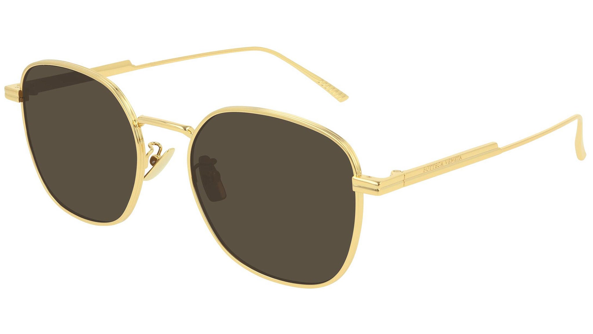 Bottega Veneta sunglasses collection model BV1014SK 003 featuring shiny gold frame and solid brown co-branding zeiss lens. Inspired by Italian culture with a global outlook, the House is defined by a distinctly refined attitude. Bottega Veneta uses noble materials to create considered pieces that become part of their owner’s lives.