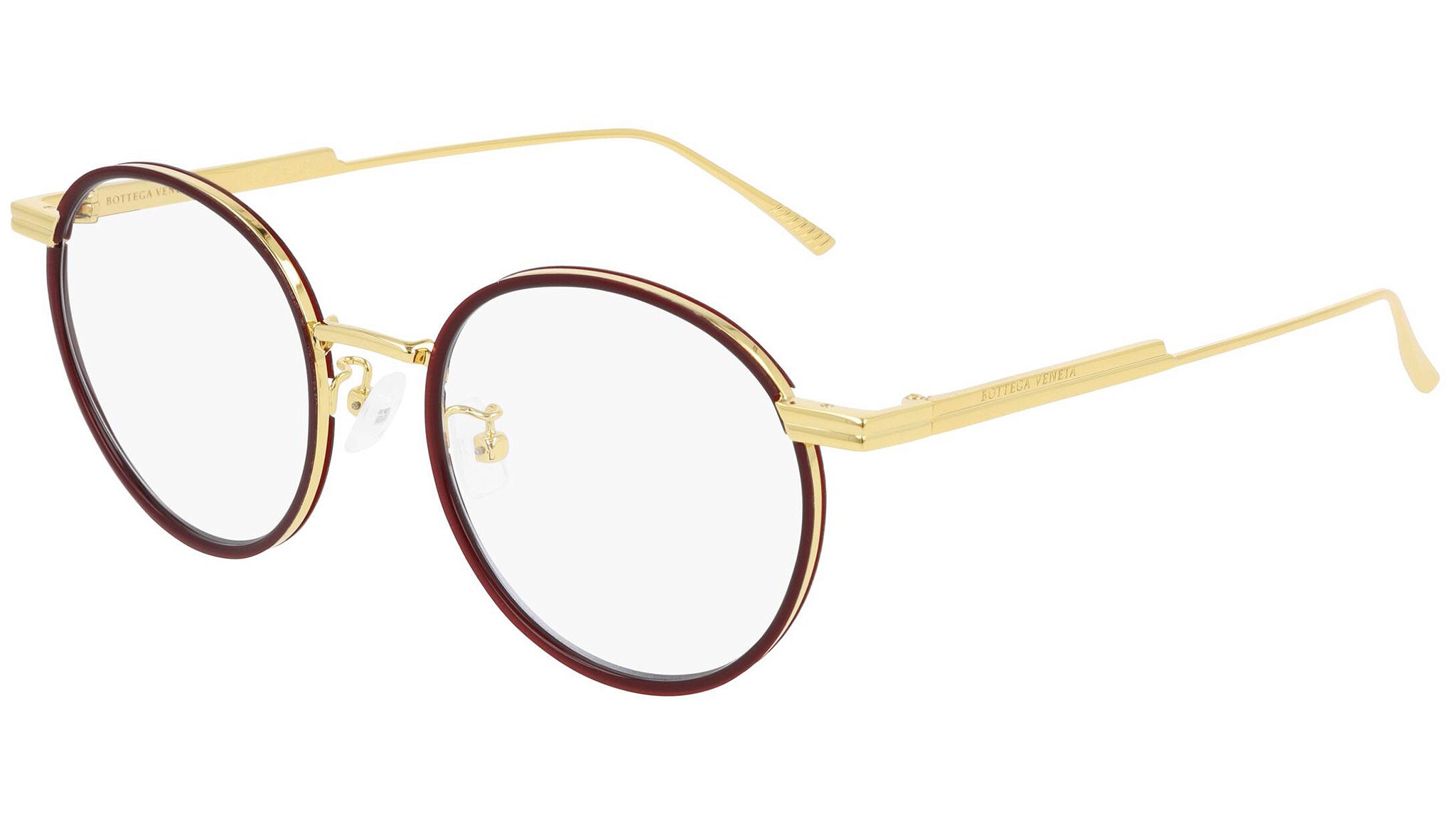 Occhiali da vista Bottega Veneta linea New classic variante colore 004 oro lucido e borgogna trasparente con astine color oro.