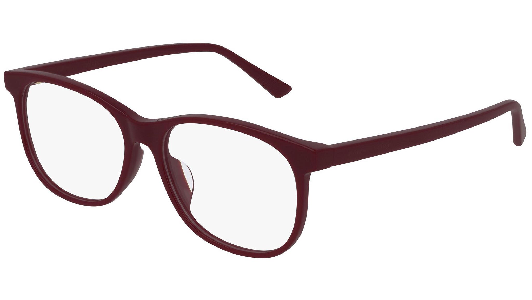 Occhiali da vista Bottega Veneta modello BV1025OA 003 featuring shiny solid burgundy frame and burgundy temple.