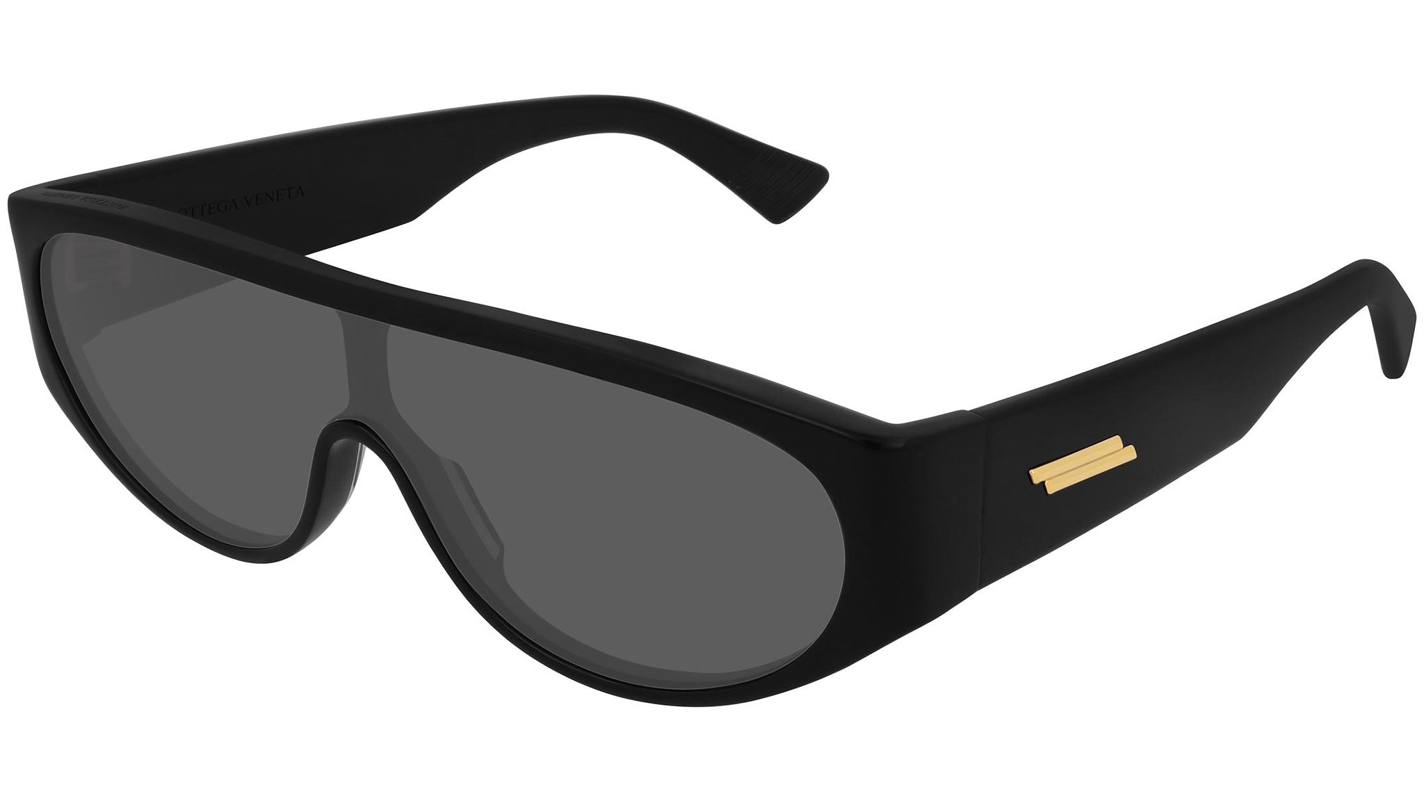 Bottega Veneta sunglasses collection model BV1027S 001 featuring shiny black frame and solid grey mask lens. Inspired by Italian culture with a global outlook, the House is defined by a distinctly refined attitude. Bottega Veneta uses noble materials to create considered pieces that become part of their owner’s lives.
