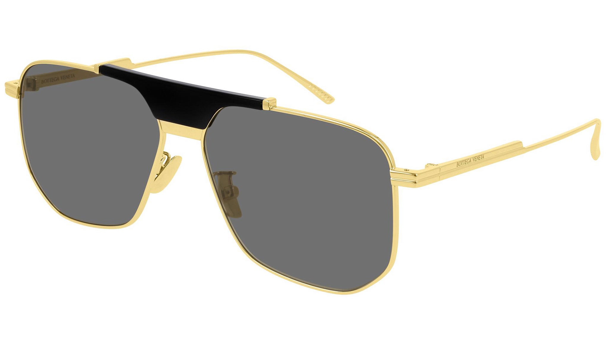 Bottega Veneta sunglasses collection model BV1036S 001 featuring shiny gold lv / shiny black frame and solid grey lens. Inspired by Italian culture with a global outlook, the House is defined by a distinctly refined attitude. Bottega Veneta uses noble materials to create considered pieces that become part of their owner’s lives.