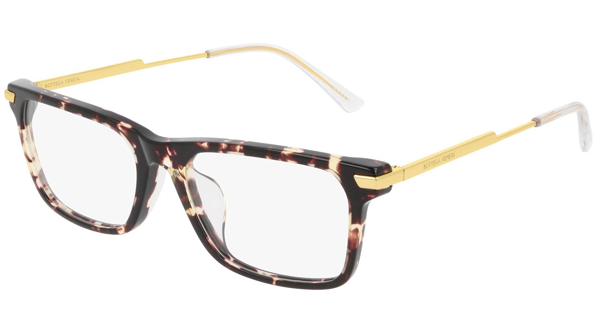 Occhiali da vista Bottega Veneta modello BV1040OA 002 featuring shiny spotted havana frame and gold temple.