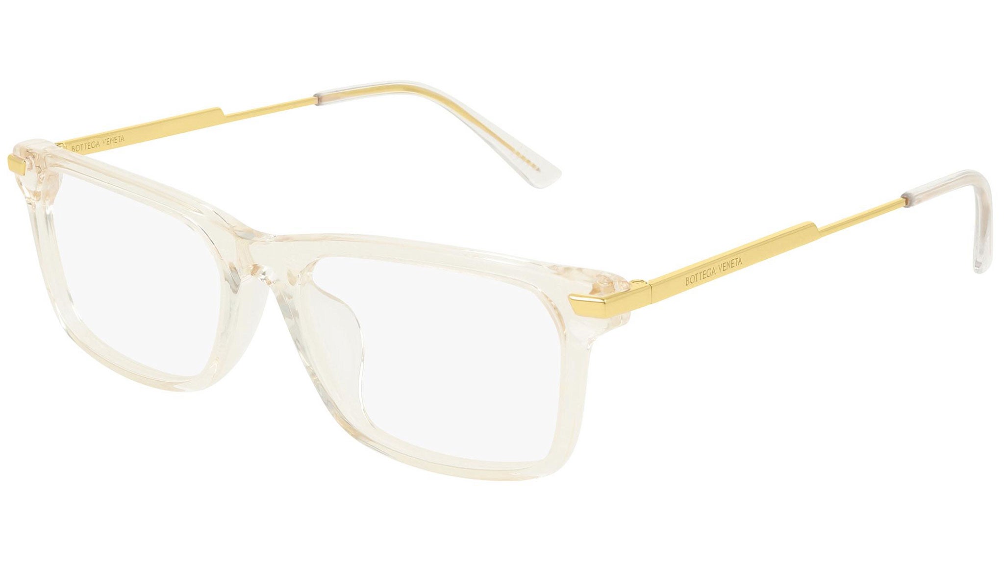 Occhiali da vista Bottega Veneta modello BV1040OA 003 featuring shiny transparent beige frame and gold temple.