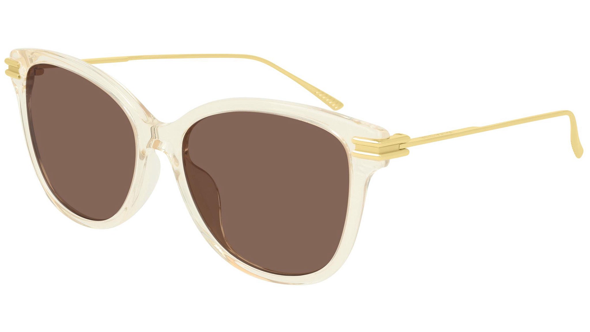 Bottega Veneta sunglasses collection model BV1048SA 003 featuring shiny transparent beige frame and solid brown lens. Inspired by Italian culture with a global outlook, the House is defined by a distinctly refined attitude. Bottega Veneta uses noble materials to create considered pieces that become part of their owner’s lives.