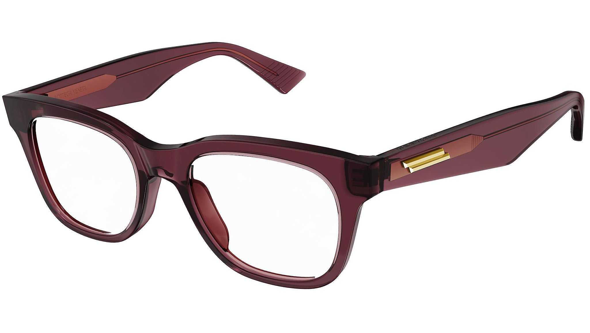Occhiali da vista Bottega Veneta linea New Classic variante colore 004 borgogna trasparente lucido con astine color rosso borgogna.