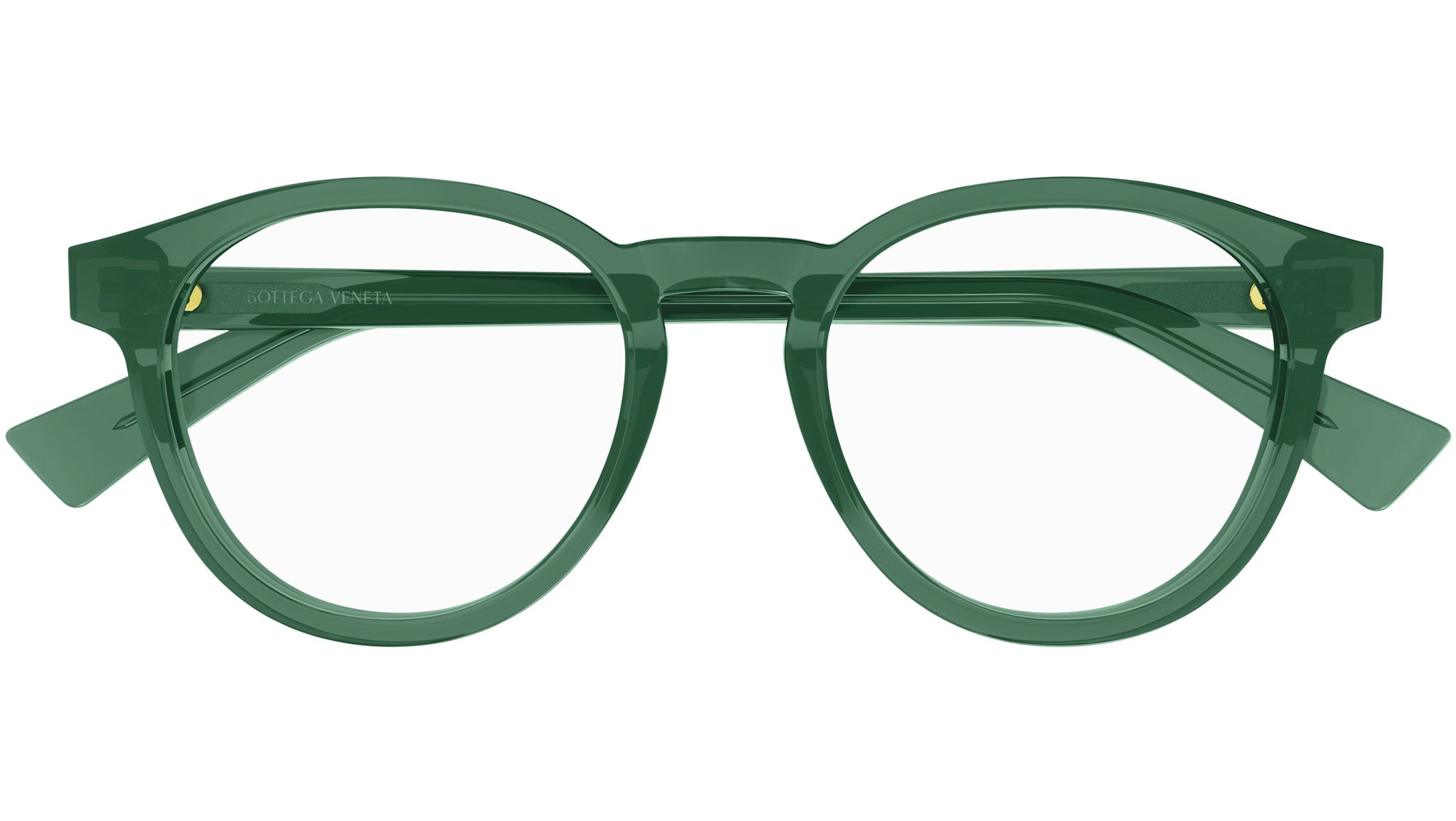 Occhiali da vista Bottega Veneta modello BV1225O linea New Classic codice colore 006 verde bottiglia trasparente lucido in acetato riciclato forma panthos con aste color verde.