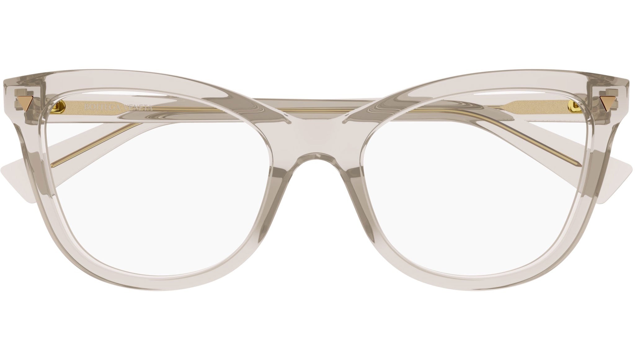 Occhiali da vista Bottega Veneta modello BV1226O linea New Classic codice colore 014 rosa trasparente lucido in acetato riciclato forma cat eye con aste color beige nude.