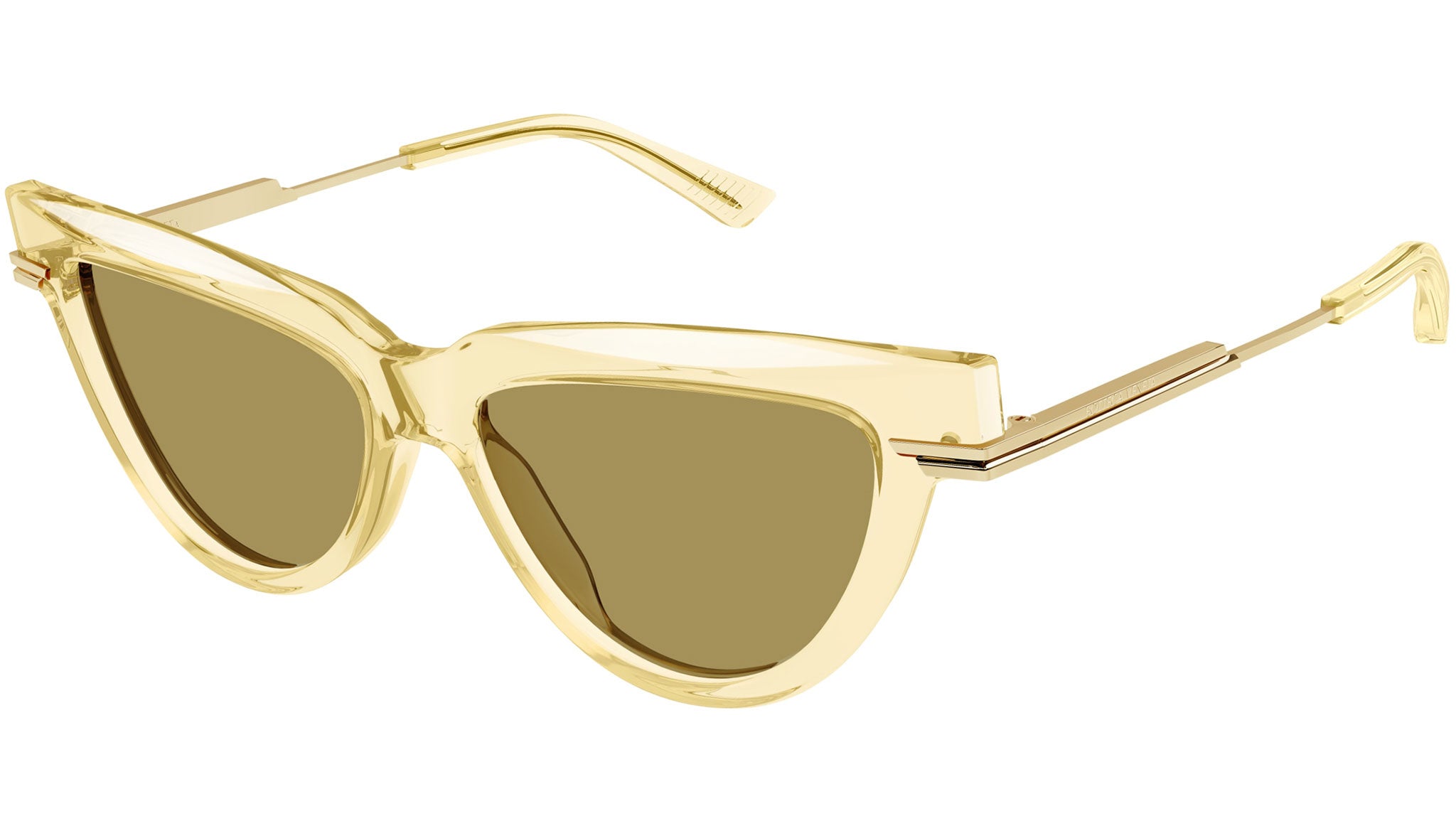 Occhiali da sole Bottega Veneta modello BV1265S linea Minimalist codice colore 004 giallo chiaro trasparente lucido in acetato riciclato forma cat eye con lenti color beige nicotine tinta unita.