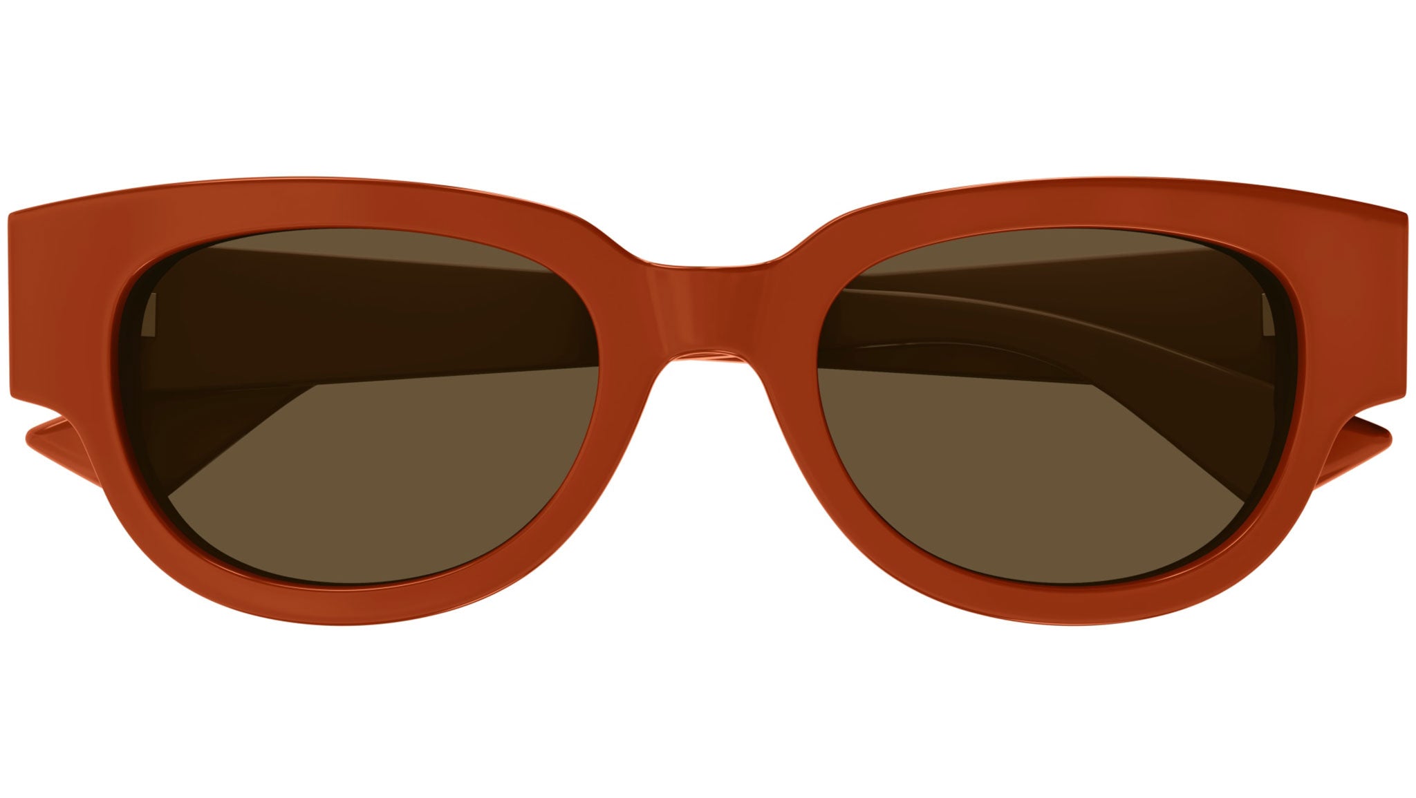 Occhiali da sole Bottega Veneta modello BV1278SA linea New Classic codice colore 004 arancione opium lucido tinta unita in acetato riciclato forma cat eye con lenti color marrone tinta unita.