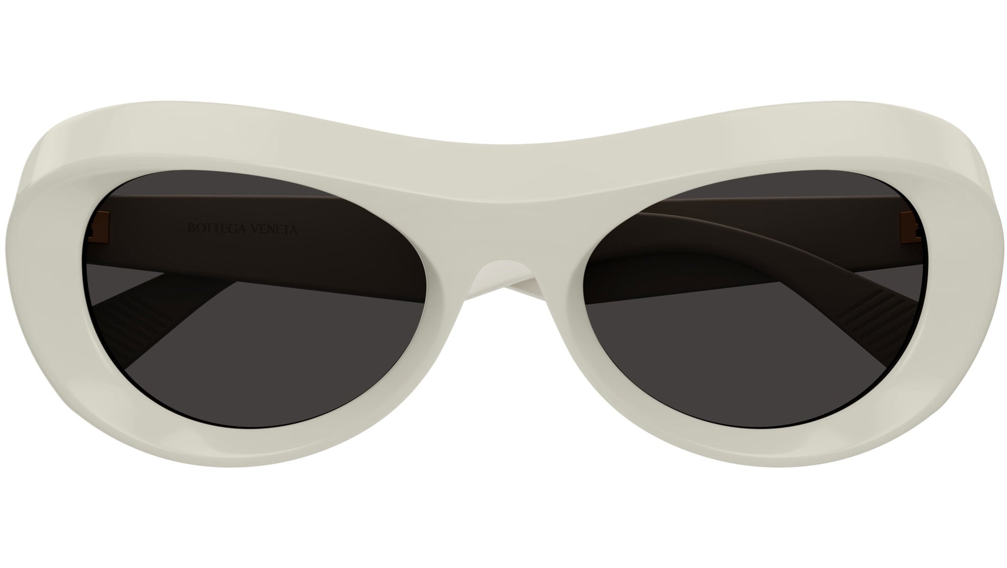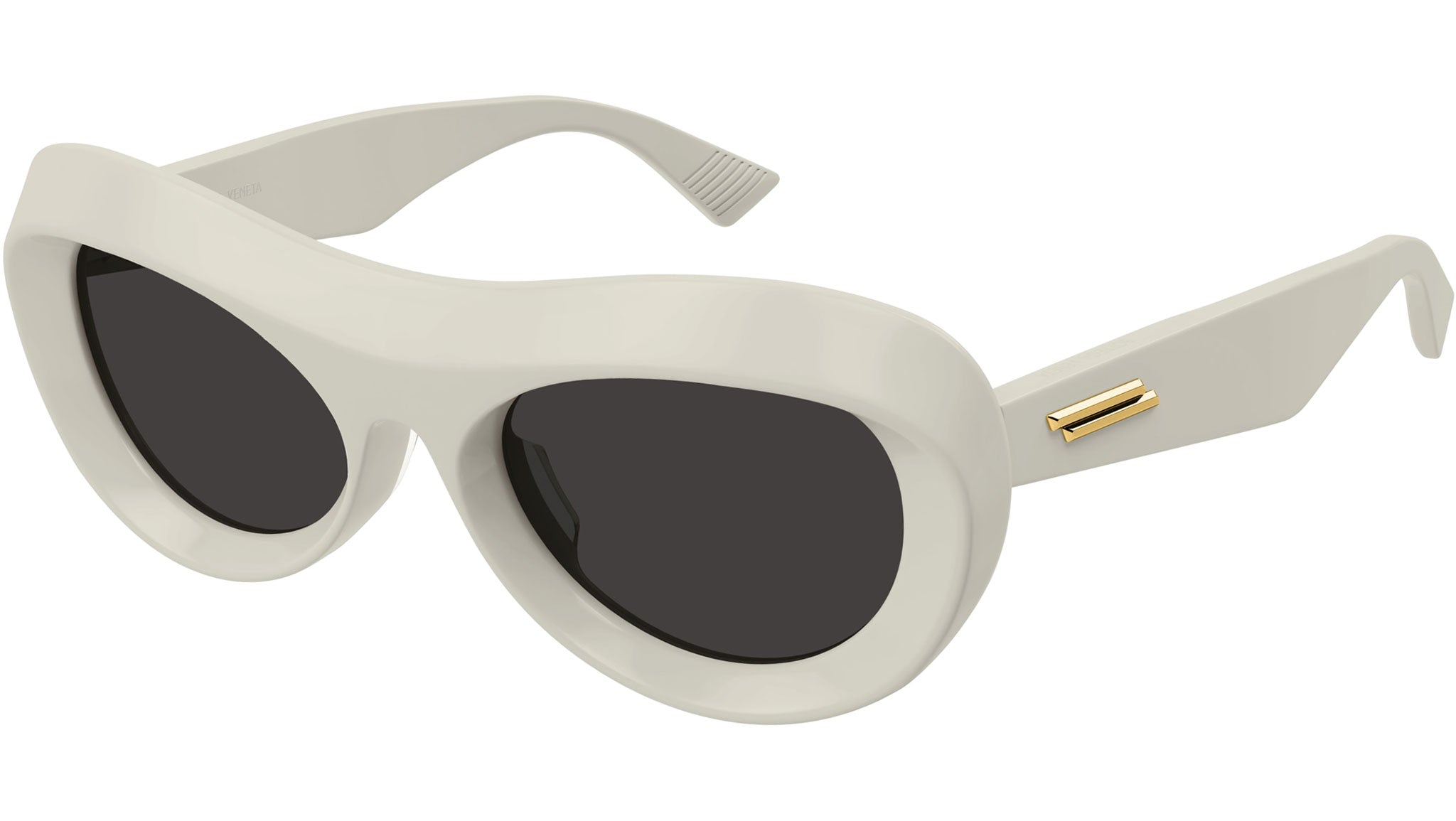 Occhiali da sole Bottega Veneta modello BV1284S linea New Classic codice colore 003 bianco gesso solido lucido in acetato riciclato forma panthos con lenti color grigio tinta unita.