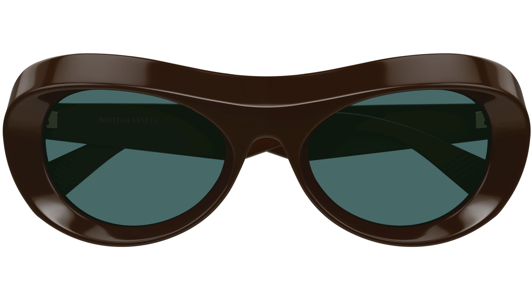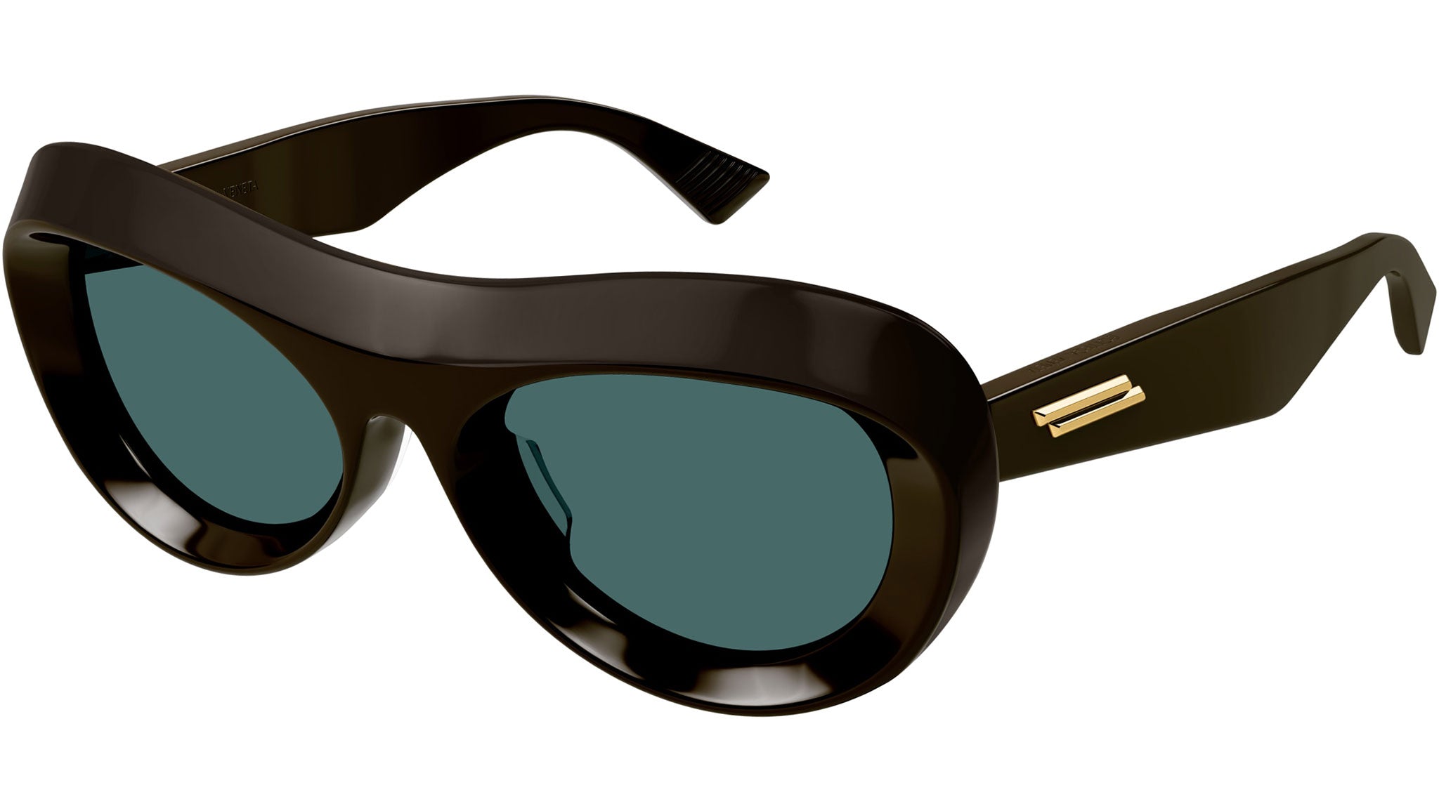 Occhiali da sole Bottega Veneta modello BV1284S linea New Classic codice colore 004 cioccolato tinta unita lucido in acetato riciclato forma panthos con lenti color blu verde tinta unita.