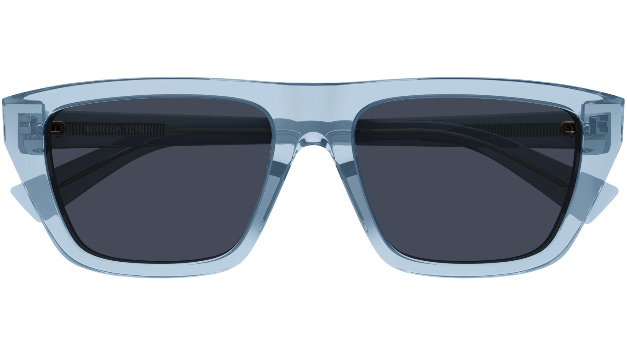 Occhiali da sole Bottega Veneta modello BV1291S linea New Classic codice colore 003 azzurro trasparente lucido in acetato riciclato forma rectangle con lenti color blu dust solido.