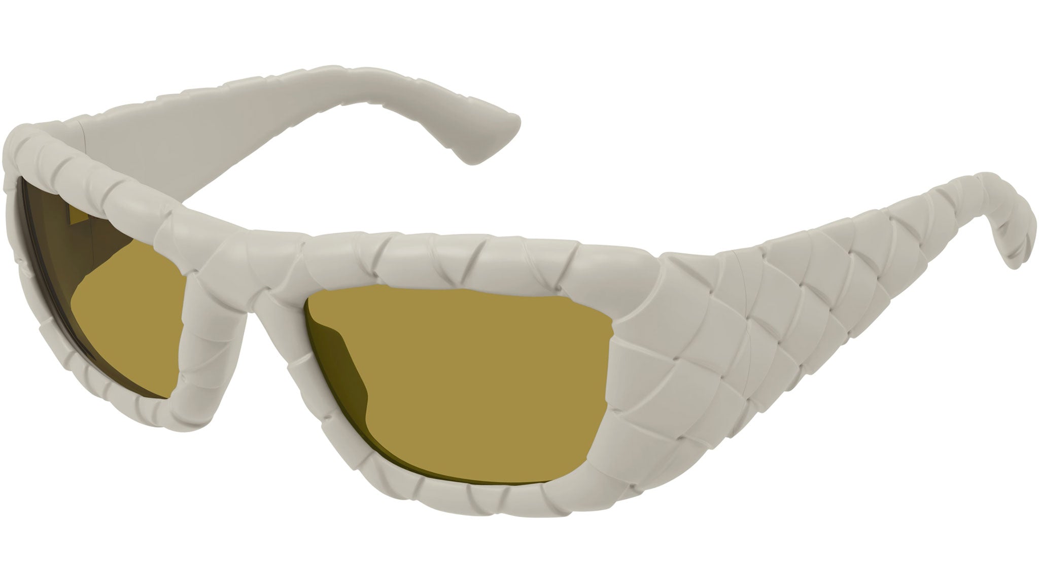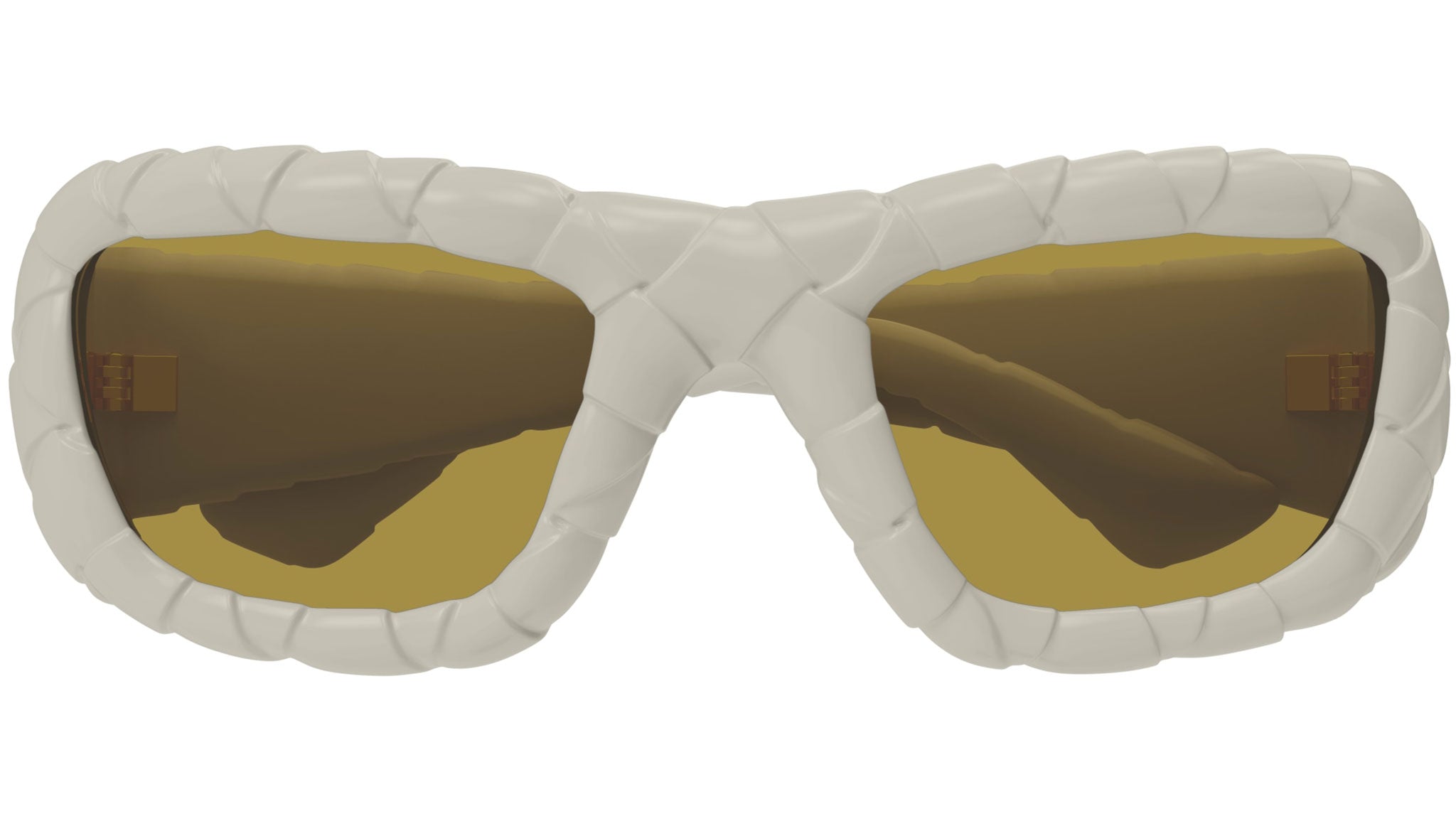 Occhiali da sole Bottega Veneta modello BV1303S linea Unapologetic codice colore 006 bianco gesso solido soft touch in injection forma panthos con lenti color beige nicotine tinta unita.