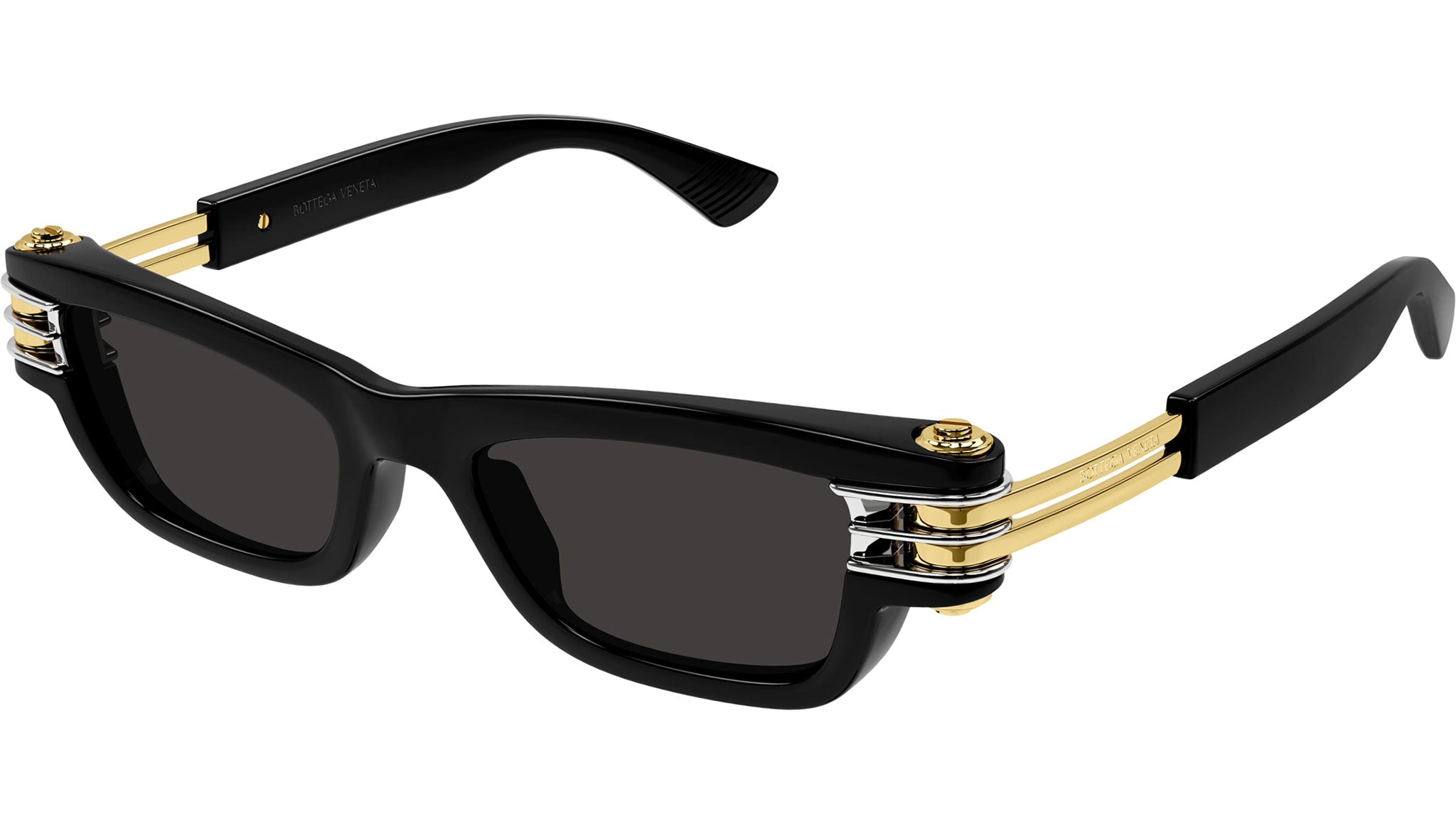 Occhiali da sole Bottega Veneta modello BV1308S linea Unapologetic codice colore 001 nero lucido tinta unita in injection forma rectangle con lenti color grigio tinta unita.