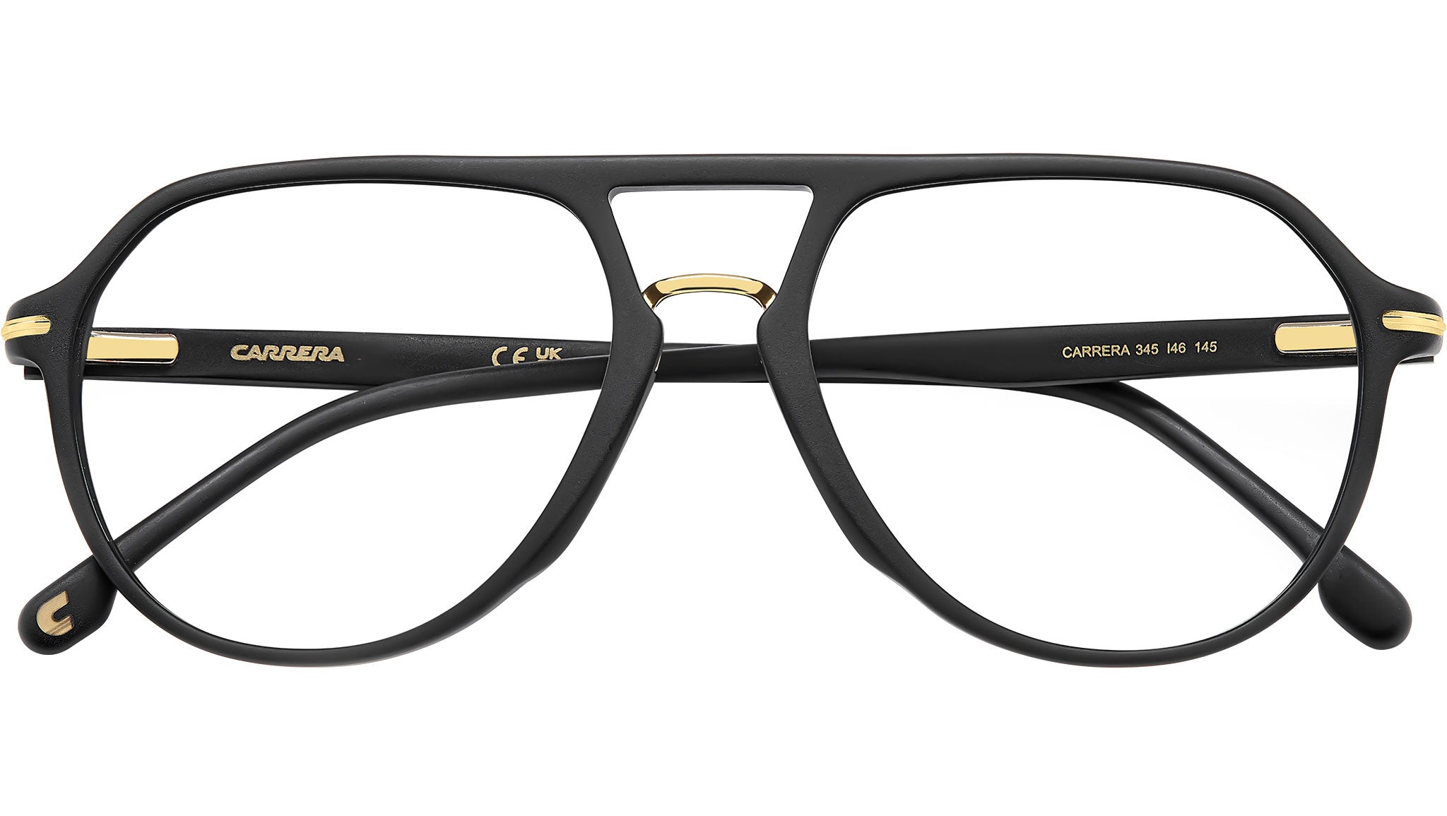 Occhiali da vista Carrera 345 I46 uomo con montatura aviatore in acetato nero opaco oro e lenti demo. Occhiali da vista Carrera in stile pilot, riconoscibile e identitario. Il modello è ricco di dettagli cult, quali il ponte in metallo, le aste a pinna e il dettaglio metallico sul frontale. Indossarlo è un piacere: realizzato in acetato leggero, presenta spessori sottilissimi e cerniere flessibili. Esprimere la propria personalità è facile con le varianti colore proposte, anche trasparente, bi-color o con aste multistrato nei colori Carrera. Linea: Signature. Codice modello: 108973. Codice colore: I46. Rivenditore autorizzato Carrera online. Gli occhiali vengono consegnati con custodia e accessori originali e sono coperti dalla garanzia ufficiale di 12 mesi del produttore.