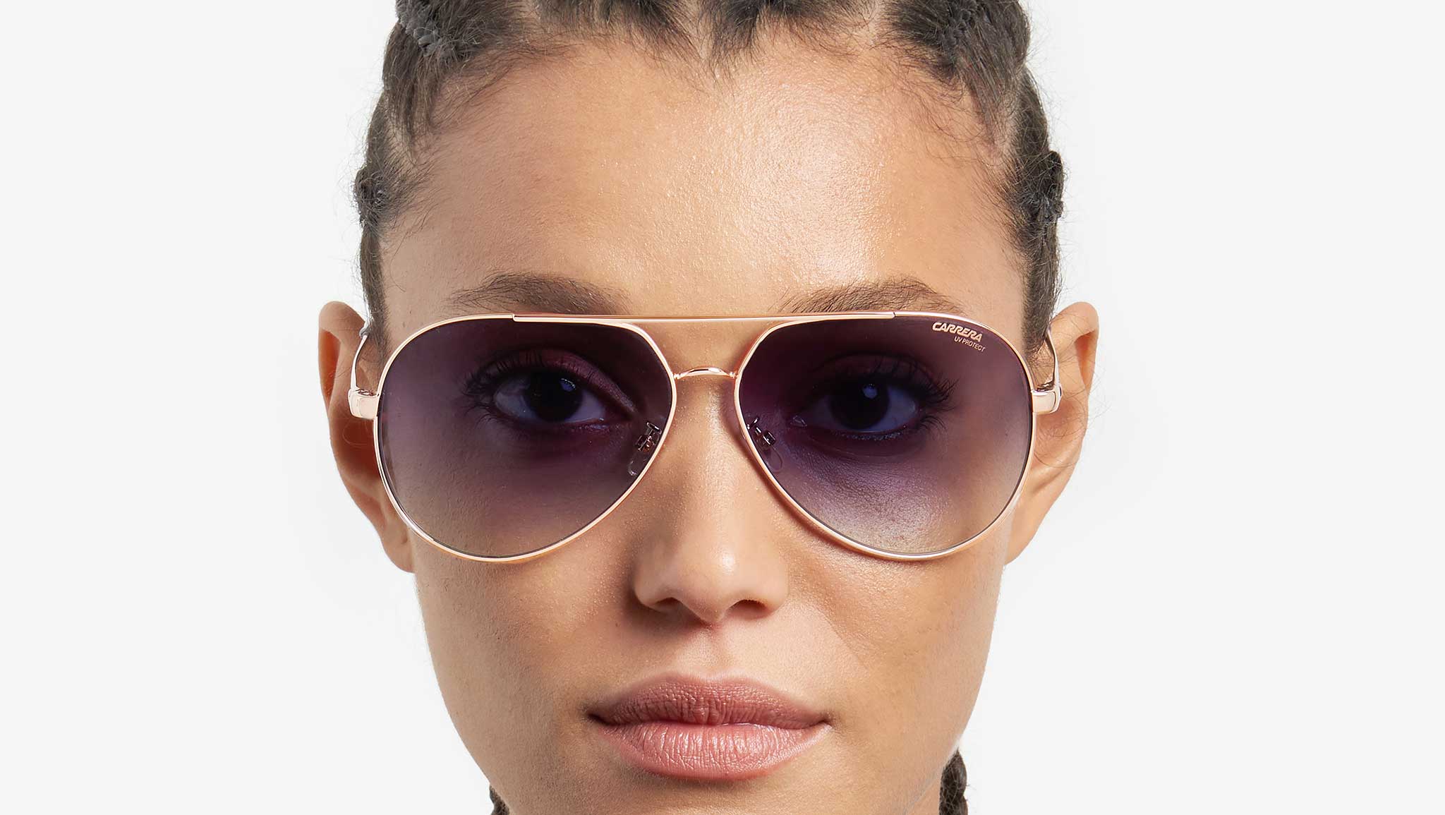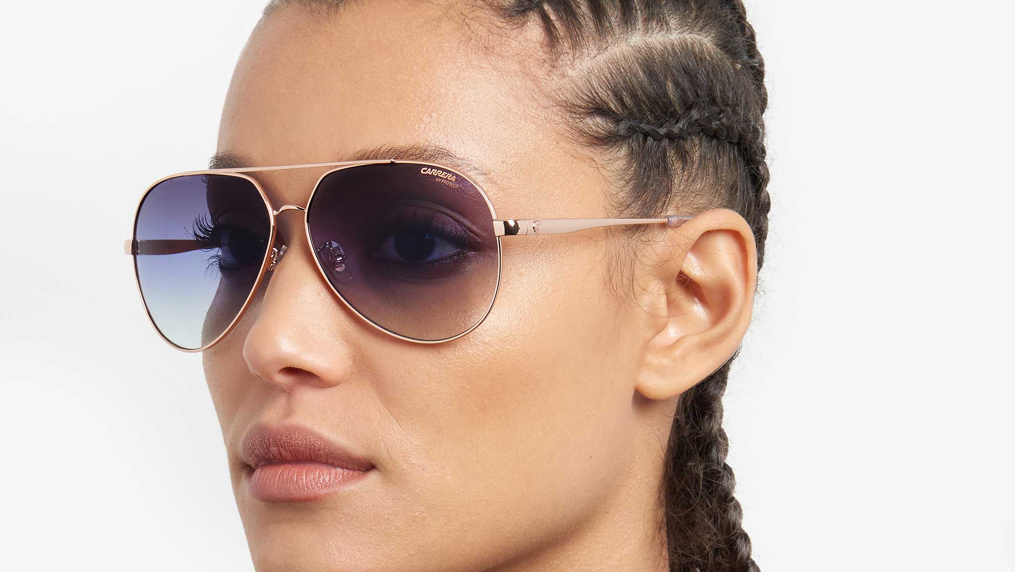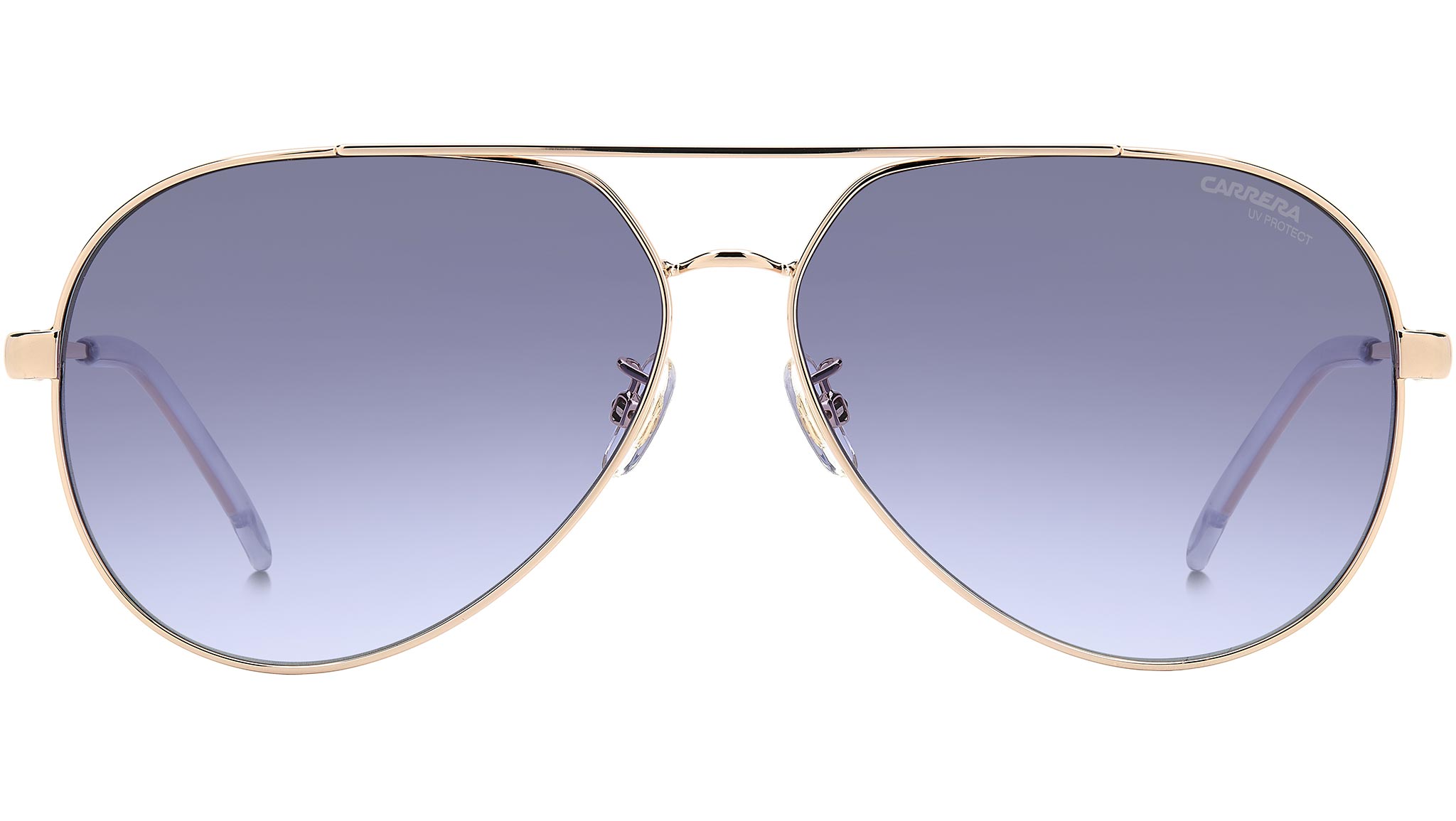 Occhiali da sole Carrera modello 3005/S colore LKS GB gold blue. Questi occhiali da sole per donna interpretano una silhouette iconica Carrera – quella pilot – in chiave contemporanea e fashionista. La montatura leggera è in acciaio inossidabile, distintiva grazie al doppio ponte sopra le lenti a goccia. Il design delle aste è esaltato dal logo inciso e dai terminali a contrasto. Notare le lenti: disponibili nelle varianti sfumate, oppure in versione polarizzata, sempre con la possibilità di montare lenti graduate.