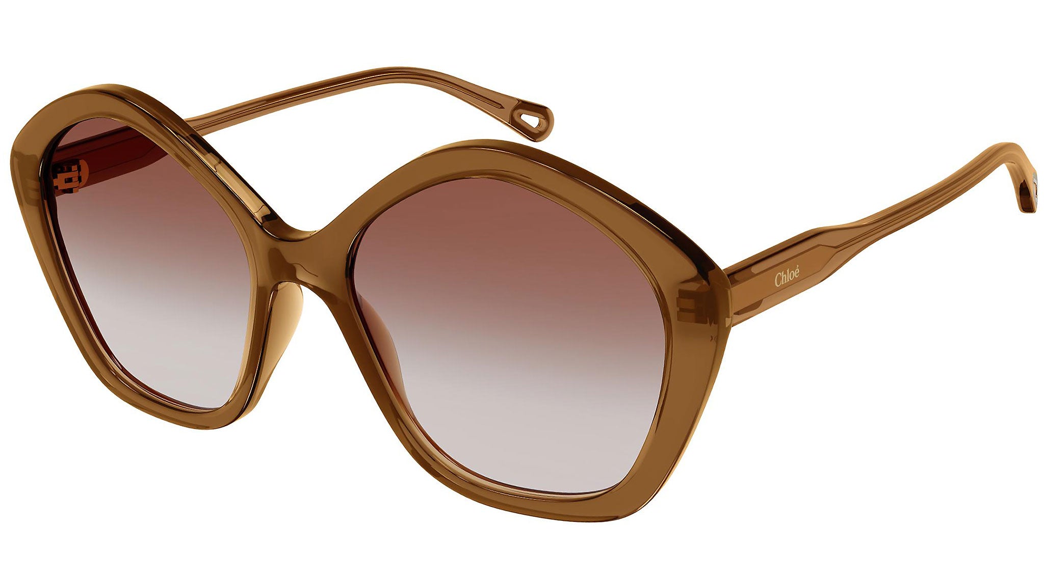 Occhiali da sole Chloé modello CH0082S 002, variante colore marrone trasparente lucido con lenti color mattone sfumato.