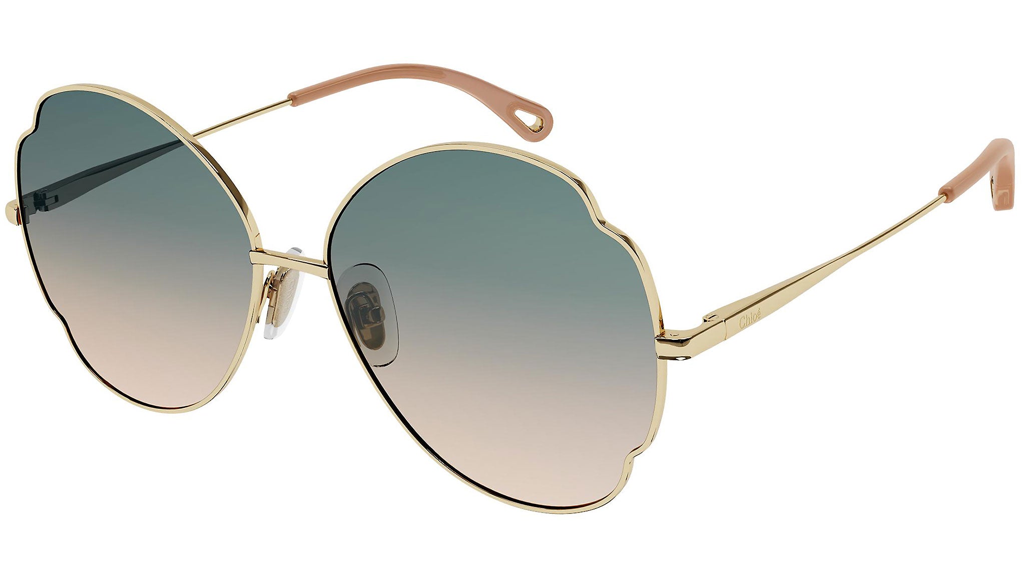 Occhiali da sole Chloé modello CH0093S 003, variante colore oro lucido classico con lenti color doppia sfumatura petrolio e beige chiaro.
