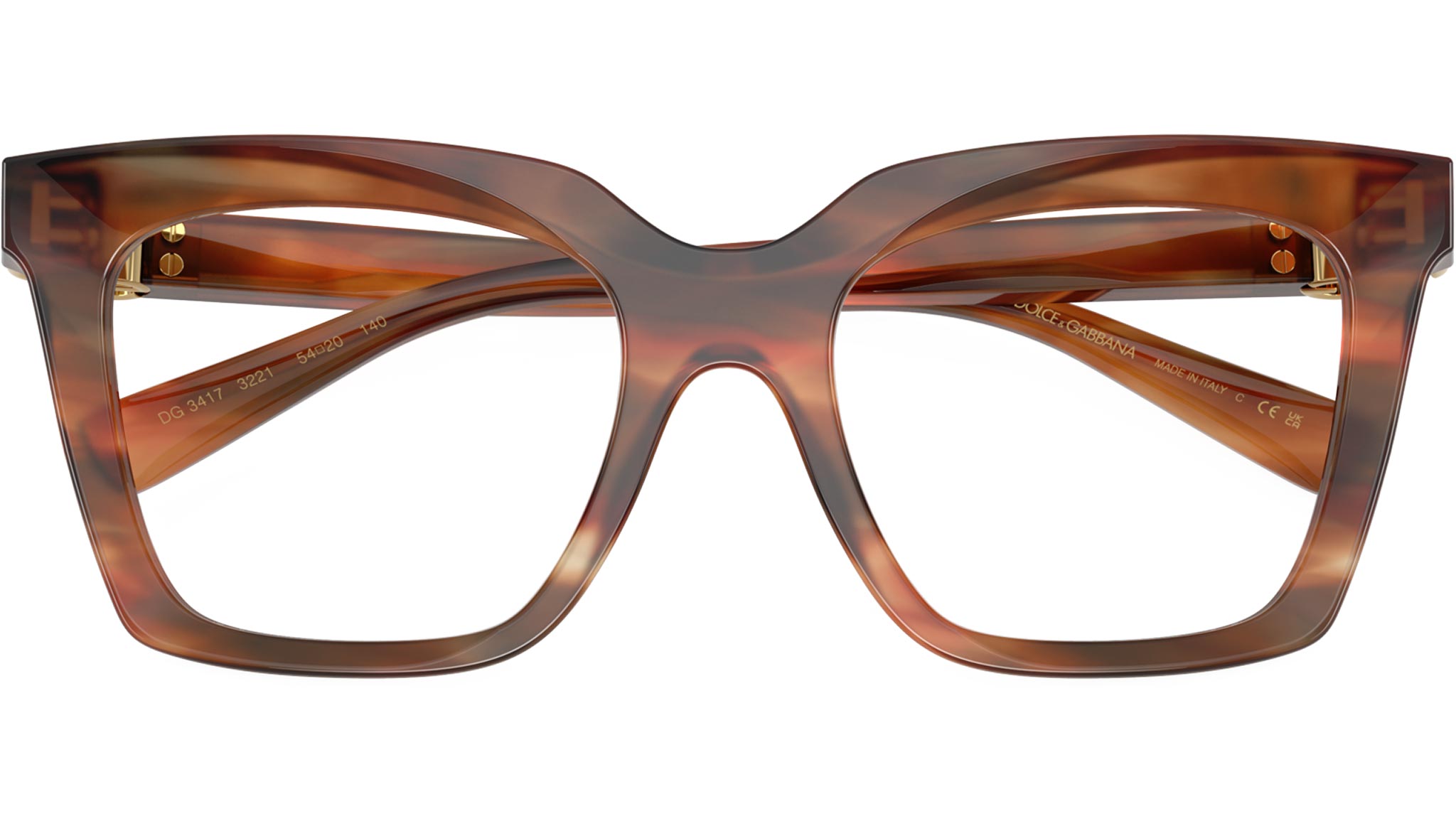 Occhiali da vista Dolce & Gabbana DG 3417 3221 donna con montatura squadrata in acetato marrone striato e lenti demo. Fit universale. Linea: Dna. Codice modello: 0DG3417. Codice colore: 3221. Made in Italy. Rivenditore autorizzato Dolce & Gabbana online. Gli occhiali vengono consegnati con custodia e accessori originali e sono coperti dalla garanzia ufficiale di 12 mesi del produttore.