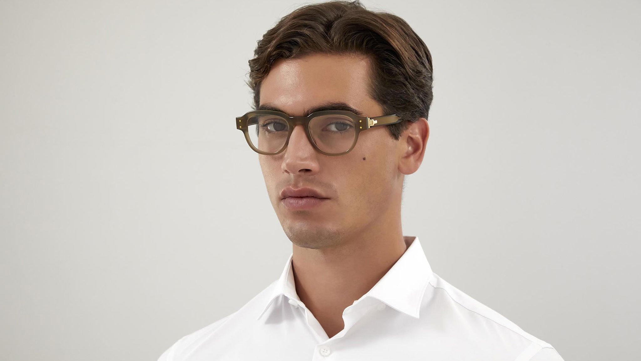 Occhiali da vista Dunhill modello 0048O, variante colore 004 fango lucido lattiginoso con astine color marrone. Forme vintage vengono reinterpretate utilizzando nuovi colori, dettagli e proporzioni. La nuova collezione offre sottili monocromi con finiture elaborate, a ulteriore conferma dell'approccio dirompente di Dunhill, che da forma a un continuo scambio tra formalità classica e disinvoltura casual.