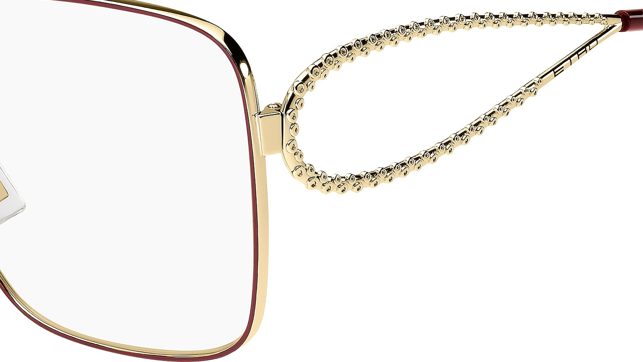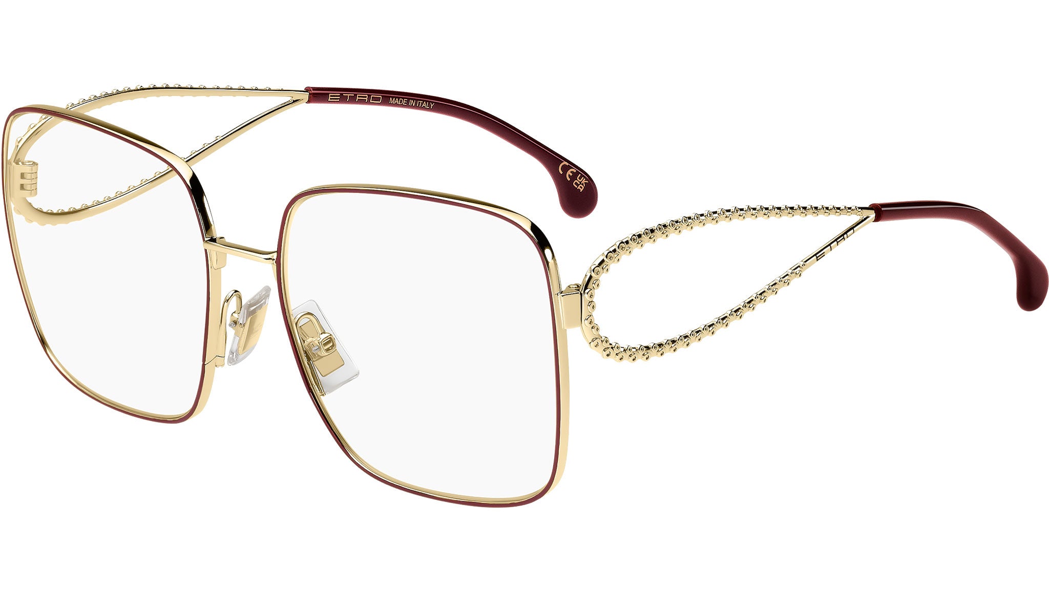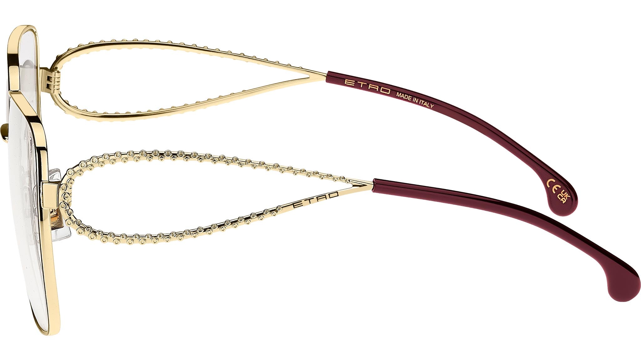 Occhiali da vista Etro 0073 6K3 donna con montatura squadrata in metallo bordeaux oro e lenti demo. Un omaggio alla libertà creativa e all'arte, gli occhiali da vista 'Etropaisley' di ETRO traggono ispirazione dalla collezione di gioielli del brand. La silhouette in metallo è arricchita da aste scultoree, lavorate con una tecnica innovativa di incisione 3D che richiama il celebre motivo Paisley, garantendo al contempo leggerezza e comfort quotidiano. I terminali in acetato e i dettagli floreali, insieme al logo ETRO, completano questo design eccezionale, disponibile in una selezione di colori eleganti. Linea: Etromania. Codice modello: 109302. Codice colore: 6K3. Rivenditore autorizzato Etro online. Gli occhiali vengono consegnati con custodia e accessori originali e sono coperti dalla garanzia ufficiale di 12 mesi del produttore.