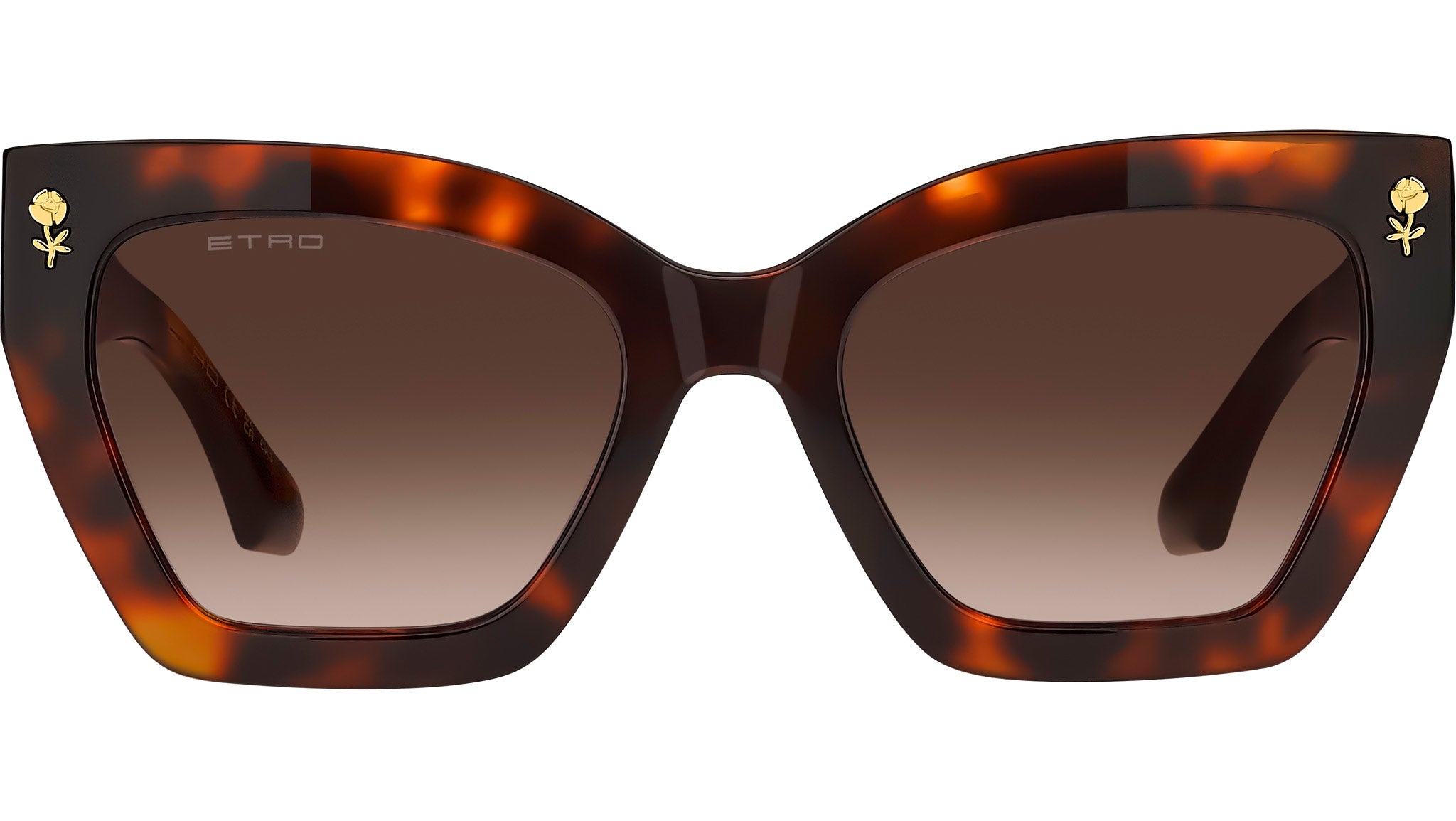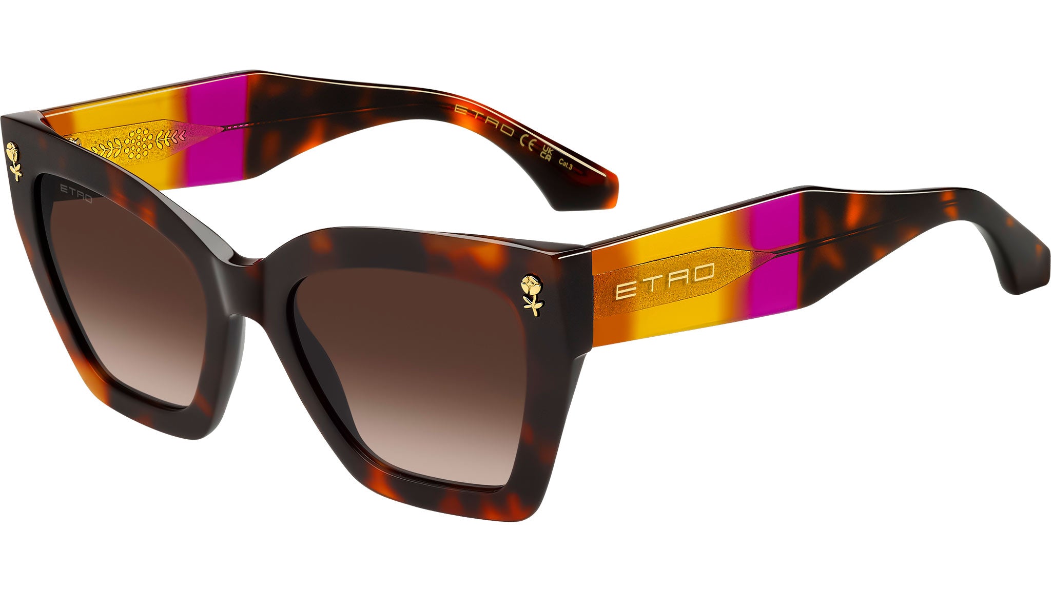 Occhiali da sole Etro 0090/S 086 HA donna con montatura rettangolare in acetato avana e lenti in CR-39 marrone sfumato. Un passo avanti nella storia delle 'Colour Stripes' di ETRO, questi occhiali da sole sono pensati per farsi notare. Il frontale in acetato, smussato per garantire leggerezza, si unisce ad aste geometriche in una palette ombré trasparente, che mette in evidenza il filo metallico grafico. I dettagli floreali, ispirati alle tecniche di ricamo più intricate, il celebre logo ETRO e i terminali iconici completano ogni modello. La palette di colori unisce tonalità classiche e trasparenze intriganti, per un effetto visivo sorprendente. Linea: Etromania. Codice modello: 207784. Codice colore: 086 HA. Rivenditore autorizzato Etro online. Gli occhiali vengono consegnati con custodia e accessori originali e sono coperti dalla garanzia ufficiale di 12 mesi del produttore.