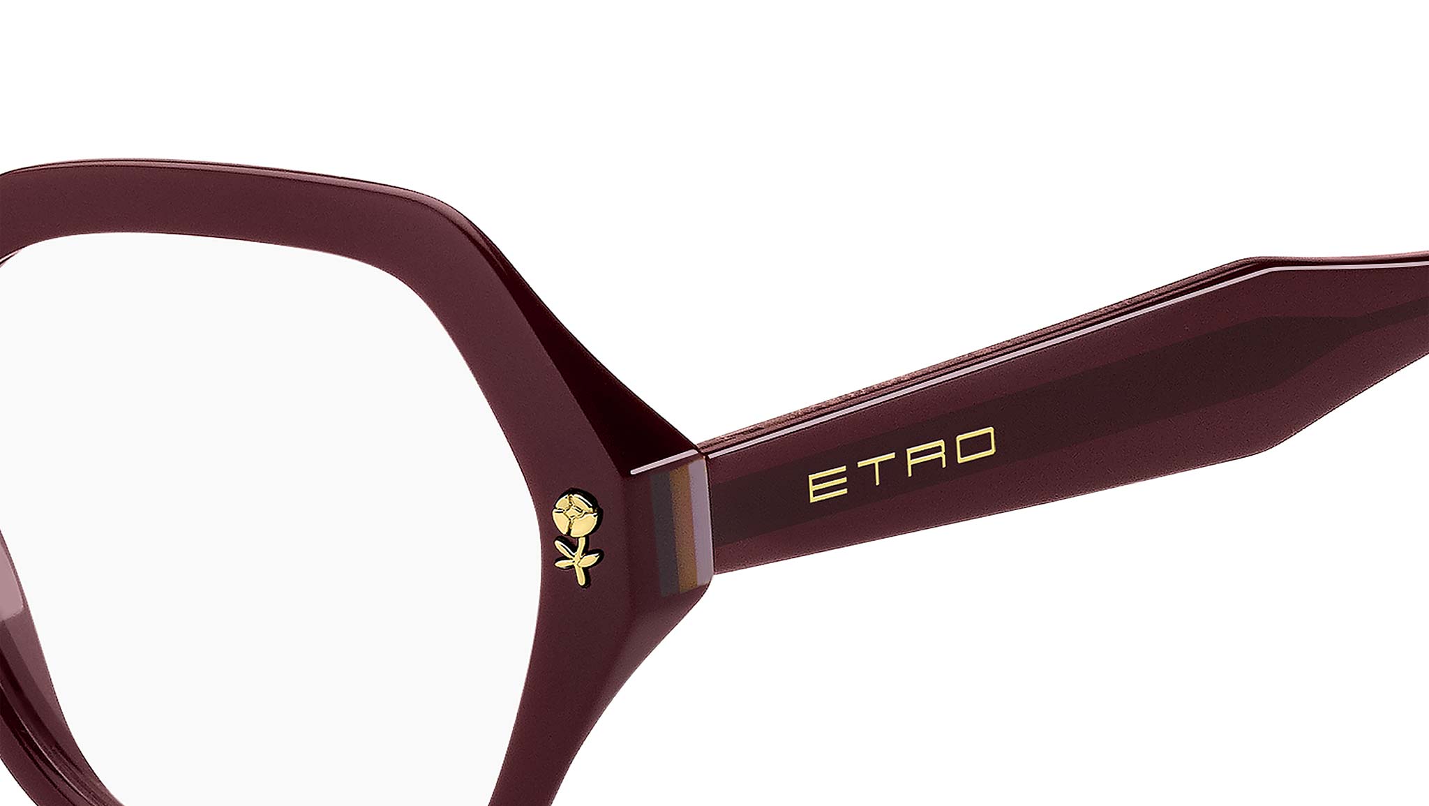 Occhiali da vista ETRO modello 0012 codice colore LHF bordeaux con lenti demo Un omaggio ai motivi floreali e pattern grafici che definiscono l'estetica di ETRO, la collezione eyewear "Graphic Elegance" traduce i ricami e le stampe della Maison in occhiali da vista eclettici e raffinati. La montatura in acetato dagli angoli smussati è impreziosita da un'applicazione in metallo a forma di fiore e un inserto a righe multicolore sui lati. Le aste sono realizzate in acetato trasparente con un'anima interna in metallo. Il design innovativo è completato dagli iconici terminali in acetato, ispirati alla simmetria del logo ETRO. Rivenditore autorizzato online ETRO Eyewear.