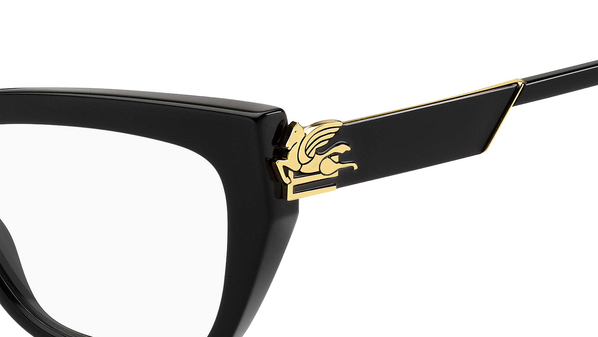 Occhiali da vista ETRO modello 0029 codice colore 807 nero con lenti demo Parte della collezione eyewear "Bold Pegaso", questa montatura da vista da donna richiama l'atmosfera ricercata dei gioielli della Maison con un inserto laccato lucido sulle aste, arricchita da una decorazione in metallo che richiama il mitico Pegaso, simbolo della casa di moda milanese. Leggeri e distintivi, questi occhiali da vista presentano un frontale in acetato e aste con terminali iconici che ricreano la simmetria del logo ETRO. Rivenditore autorizzato online ETRO Eyewear.