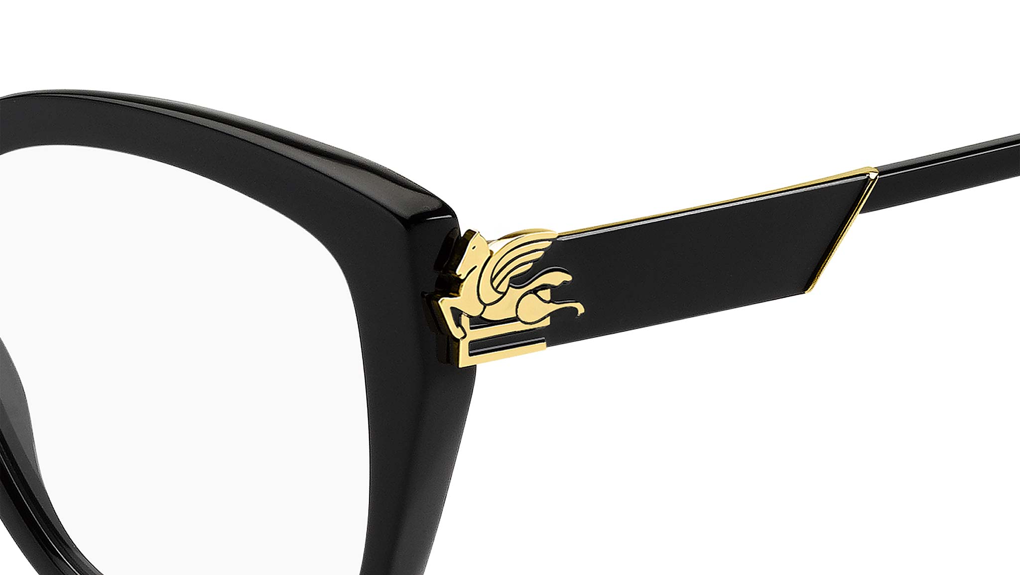 Occhiali da vista ETRO modello 0031 codice colore 807 nero con lenti demo Parte della collezione eyewear "Bold Pegaso", questa montatura da vista da donna richiama l'atmosfera ricercata dei gioielli della Maison con un inserto laccato lucido sulle aste, arricchita da una decorazione in metallo che richiama il mitico Pegaso, simbolo della casa di moda milanese. Leggeri e distintivi, questi occhiali da vista presentano un frontale in acetato e aste con terminali iconici che ricreano la simmetria del logo ETRO. Rivenditore autorizzato online ETRO Eyewear.