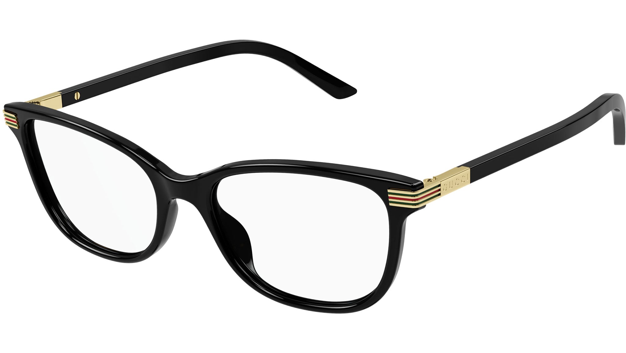 Occhiali da vista Gucci linea Web modello GG1451O 004 in acetato riciclato nero lucido con aste color nero e lenti demo.