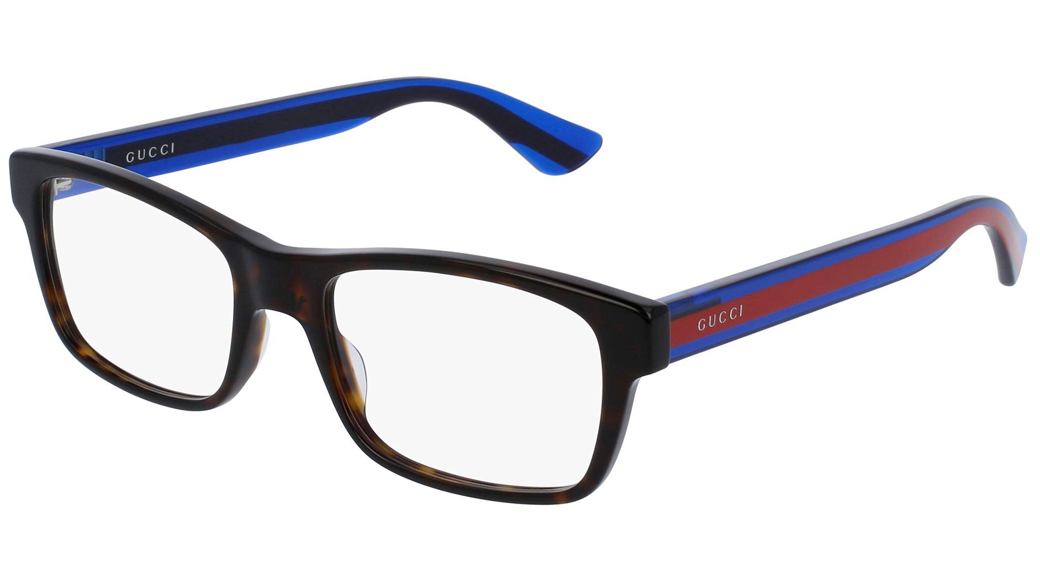 Gucci optical collection model GG0006O 003 featuring shiny dark havana frame and blue temple. Gucci Eyewear offer eclectic and contemporary creations that represent the pinnacle of Italian craftsmanship and are unsurpassed in quality, attention to detail and imaginative design. Buy your frames online and take them to your local optician to fit prescription lenses.