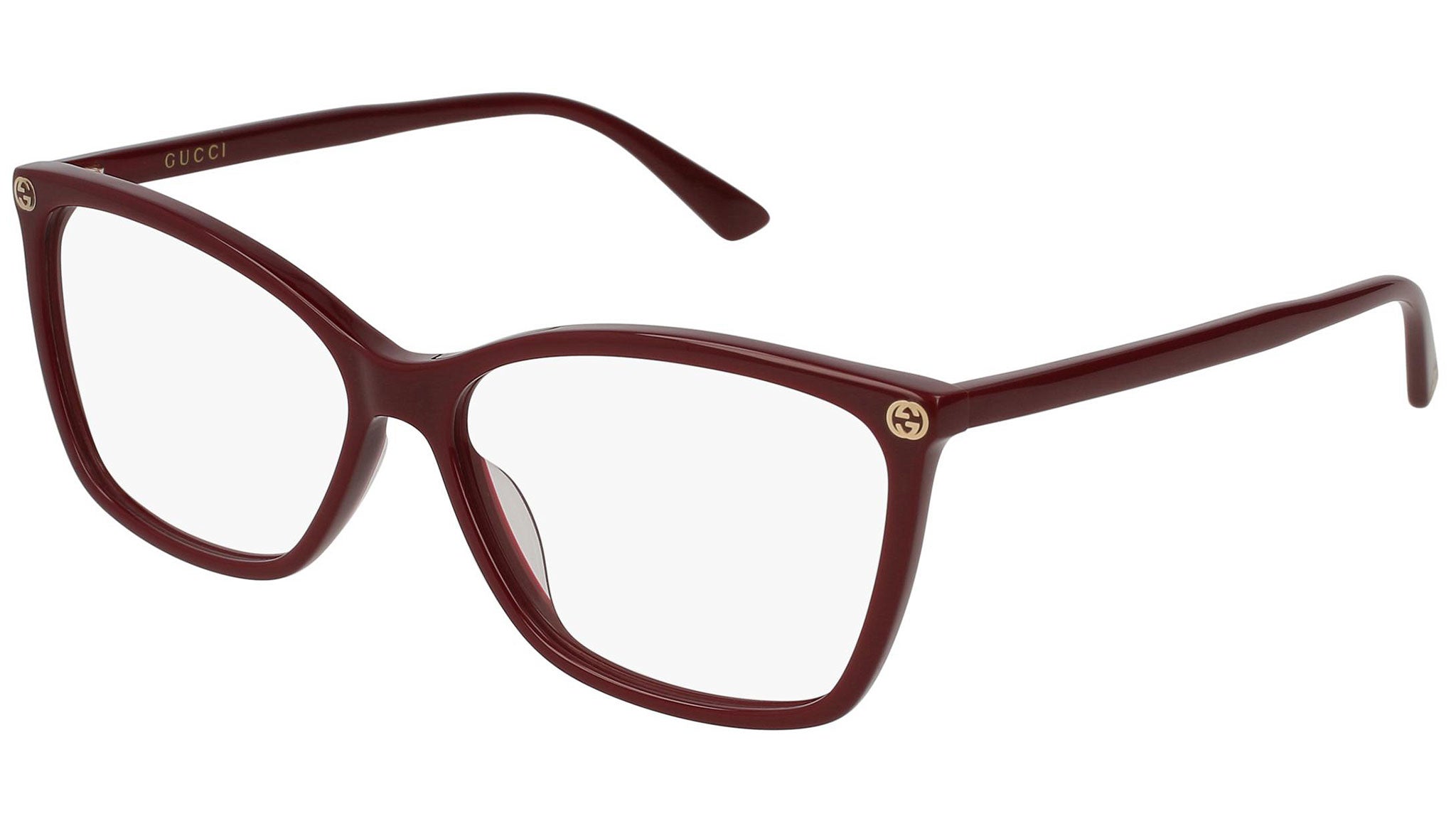 Gucci optical collection model GG0025O 007 featuring shiny burgundy frame and burgundy temple. Gucci Eyewear offer eclectic and contemporary creations that represent the pinnacle of Italian craftsmanship and are unsurpassed in quality, attention to detail and imaginative design. Buy your frames online and take them to your local optician to fit prescription lenses.