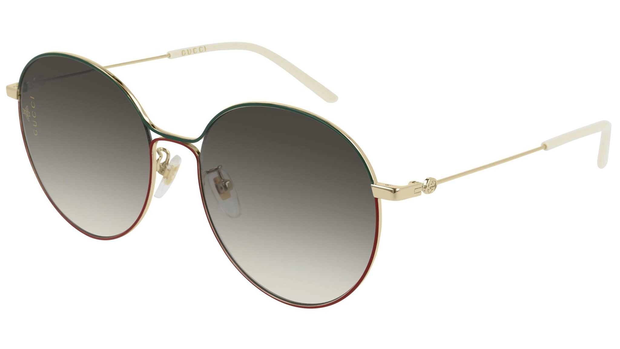 Occhiali da sole Gucci GG0395SK 003 con montatura oro endura lucido e verde e rosso e lenti color marrone sfumato. Eclettici, moderni, romantici: i prodotti Gucci Eyewear rappresentano la punta di diamante dell'artigianalità italiana, in quanto a qualità e attenzione ai dettagli. Innovativo, prestigioso e audace, Gucci sta reinventando un approccio alla moda totalmente moderno. Nella sua nuova vision creativa, la Maison ha redifinito il concetto di lusso per il 21mo secolo.