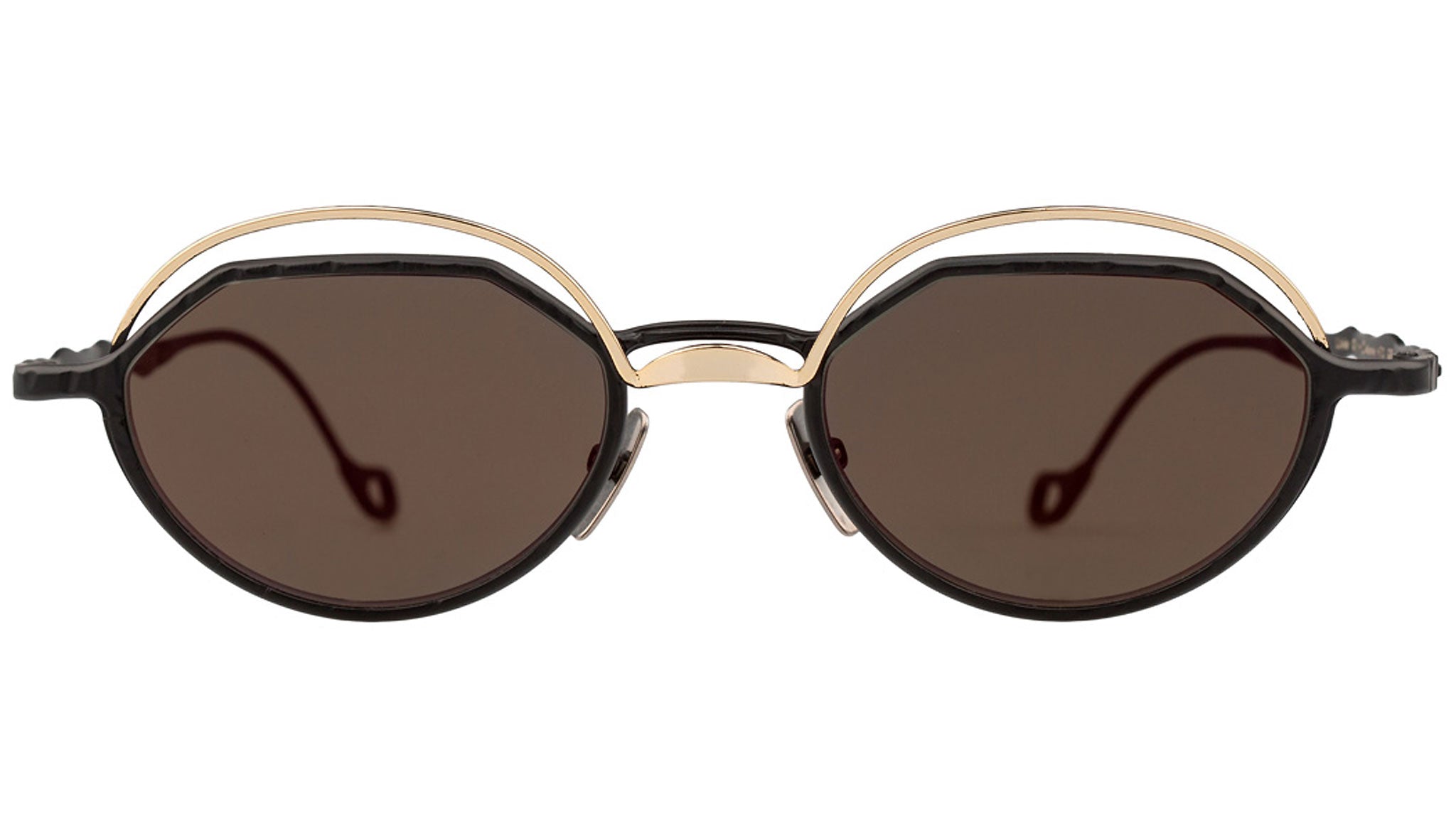 Kuboraum are masks that are designed on the face of its wearers to highlight their personality and character. Mask is synonymous with mockery and game. Kuboraum masks are synonymous with protection and shelter; they are cubical rooms where we shelter ourselves, free to live our intimacy and look at the world through two lenses. All masks are entirely dreamed in Berlin and handmade in Italy. H70 is a titanium oval frame shape. Gold and black frame with flashgold lenses.