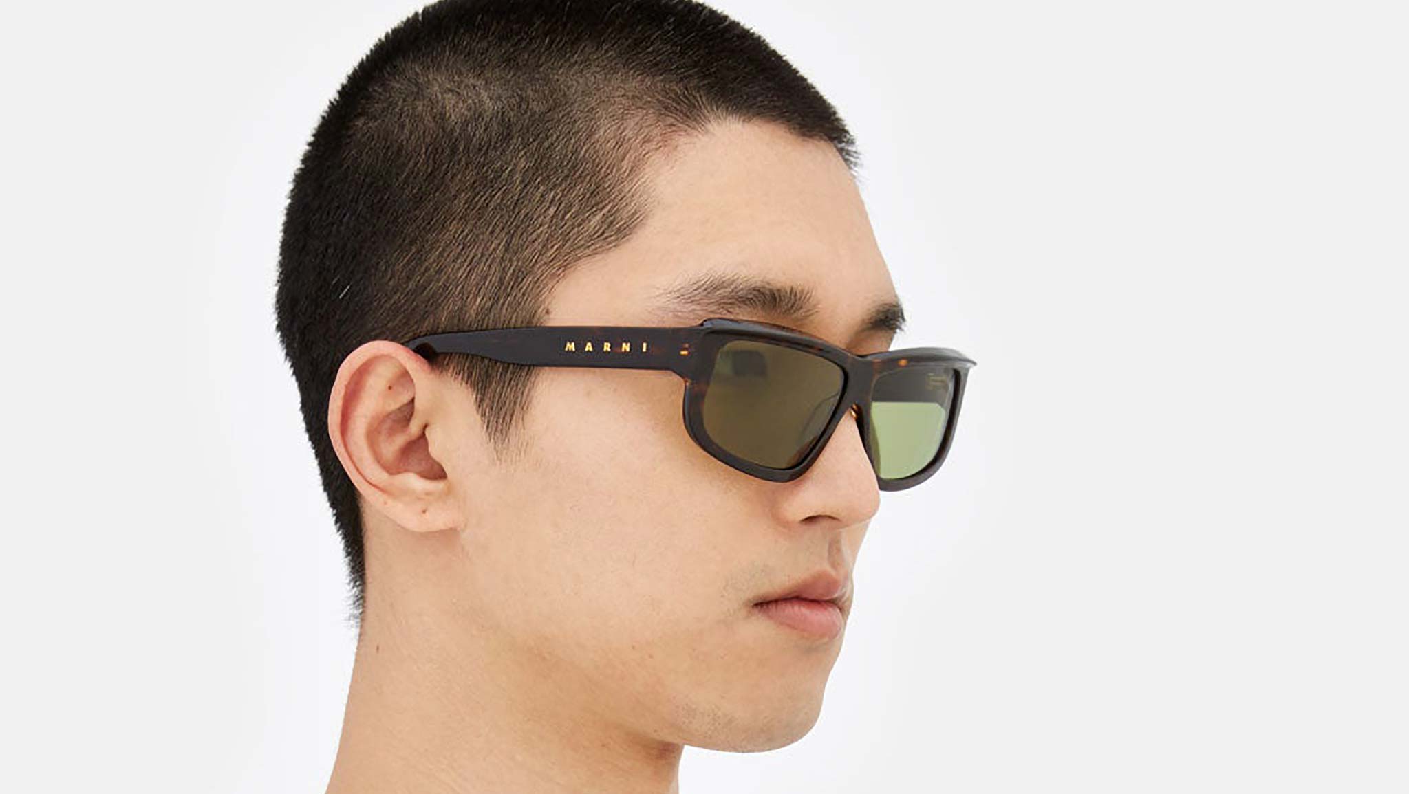 Designed exclusively for Marni, Annapuma Circuit is a silhouette that embraces a fast-paced sportswear heritage, reinterpreting it with a high-end approach to design. The model features a slight wrap-around structure, with a distinctive stretched brow-piece, a nod towards daring sporting features. The squared profile with slanted rims on the bottom, gives this shape its daredevil character. This model is available in a dark Havana acetate with bottle green lenses. Sizes: R / R Lens Width: 62 mm. Frame Front: Frame Side: 145 mm. Product Code Size R: L3U Product Code Size R: LP0