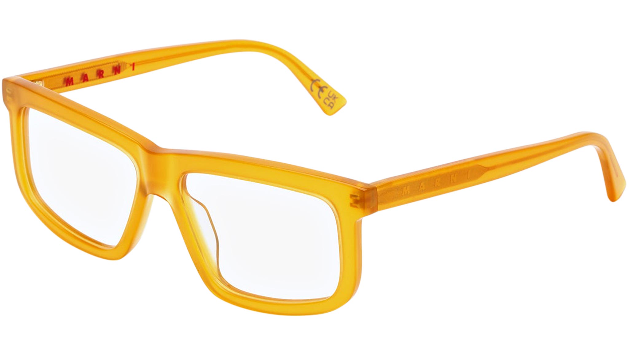 Designed exclusively for Marni, this is an Optical interpretation of the bold Annapuma Circuit sun silhouette. The model is characterised by sportswear-inspired design, seen from its slanted angular shape and thick curves. Wide horizontal lenses and sturdy acetate construction elevate these everyday glasses into a unique piece of design. This version is available in a soft and silky honey acetate. Sizes: R Lens Width: 57 mm. Frame Front: Frame Side: 145 mm. Product Code Size R: 94X