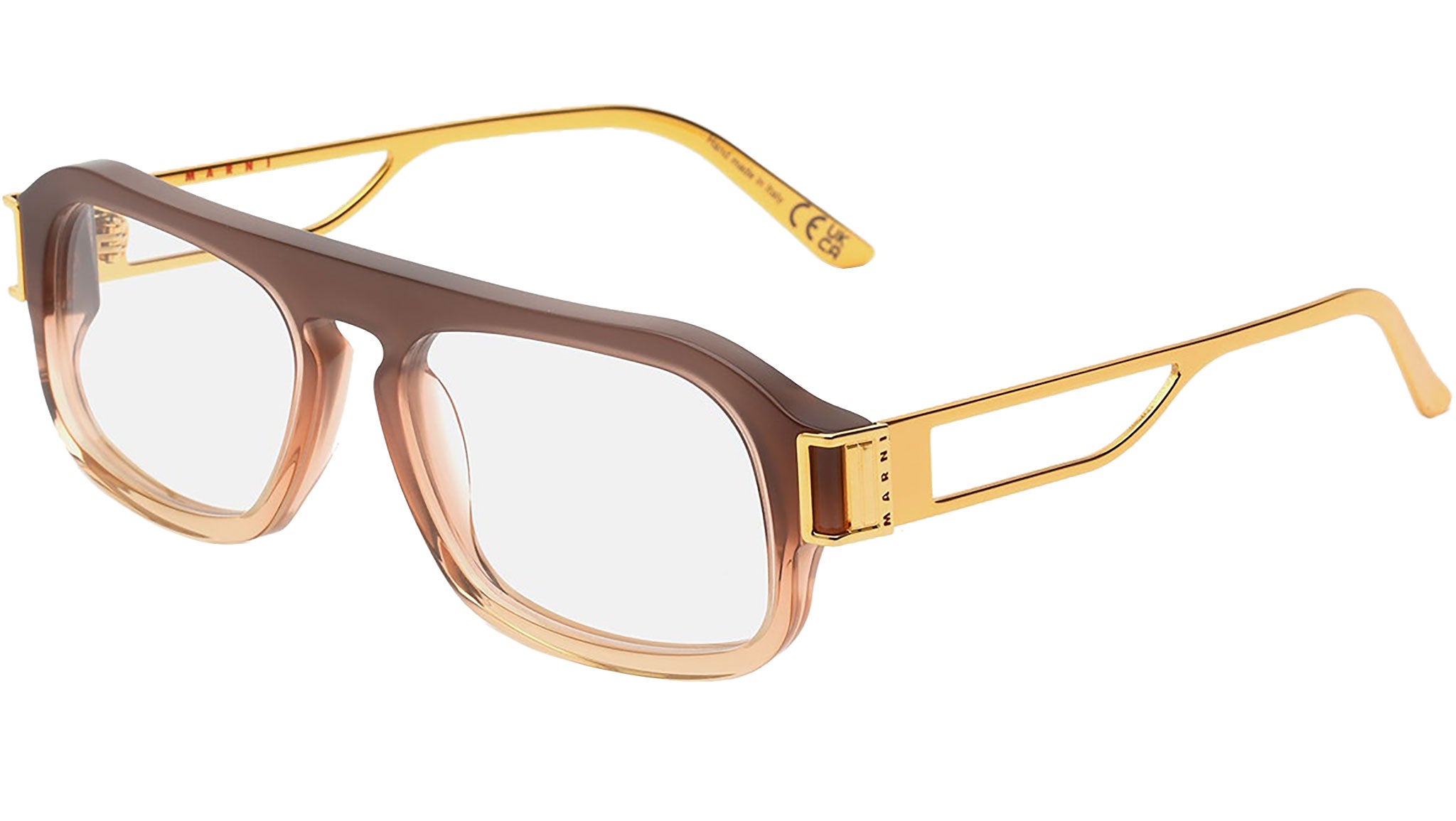 Designed exclusively for Marni, Burullus is a playful, eclectic 1970s shape characterised by a sturdy yet oversized frontal piece and unique metal temples. The model features a bold nose-bridge and wide squared lenses, with a custom-designed Marni décor joining the front and temples. A lightweight metal construction for the temples counterbalances the thick acetate front for this brown fading frame with gold metal temples. Sizes: R Lens Width: 55 mm. Frame Front: Frame Side: 140 mm. Product Code Size R: X2P