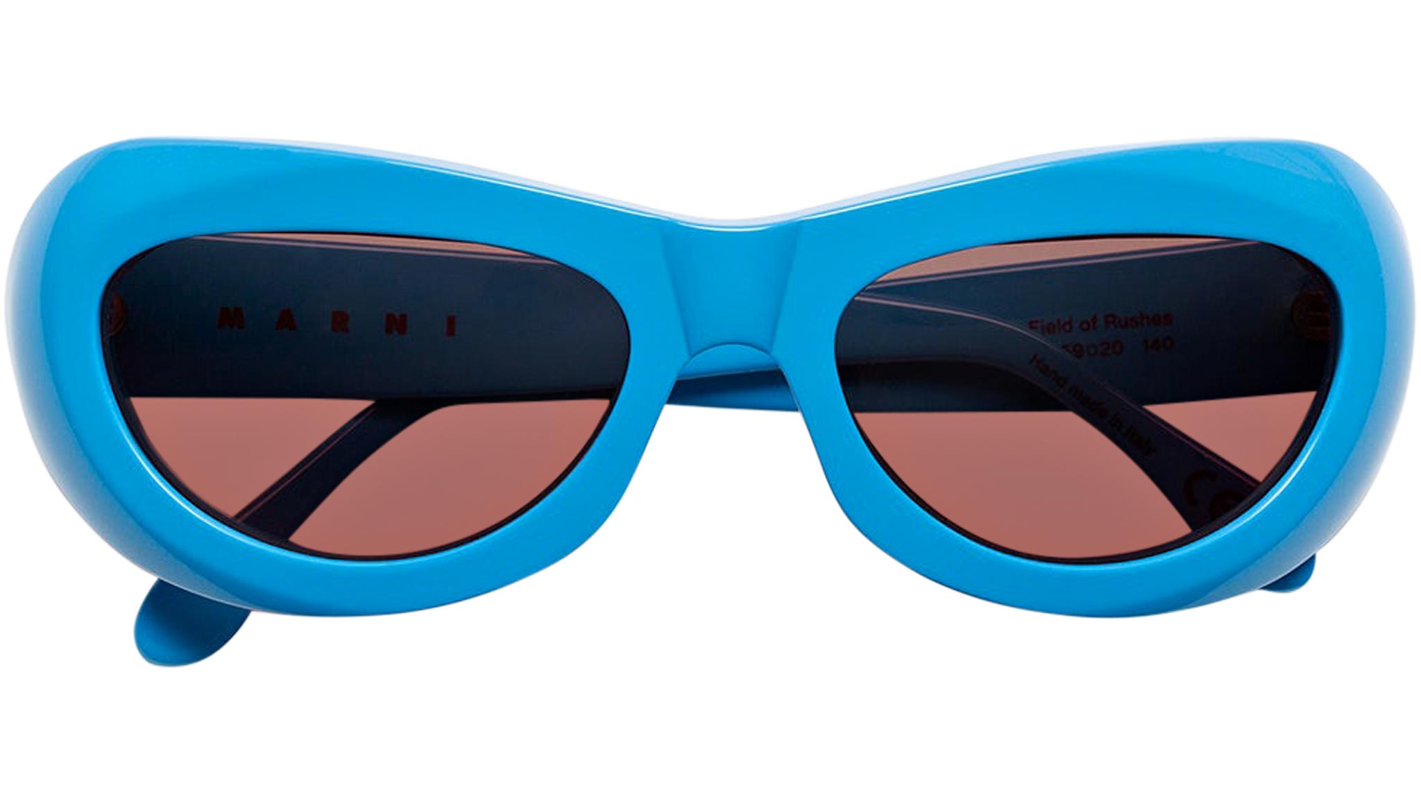 Designed exclusively for Marni, Field of Rushes is a rounded yet compact silhouette characterised by a low nose-bridge and oval lenses. The model’s key feature are its extra-thick acetate rims, milled around the edges to form a rounded, sleek shape. Sturdy temples with an engraved Marni logo complete the piece. This version comes in blue acetate with burgundy lenses and gold decors. Sizes: R Lens Width: 59 mm. Frame Front: Frame Side: 140 mm. Product Code Size R: EZ5