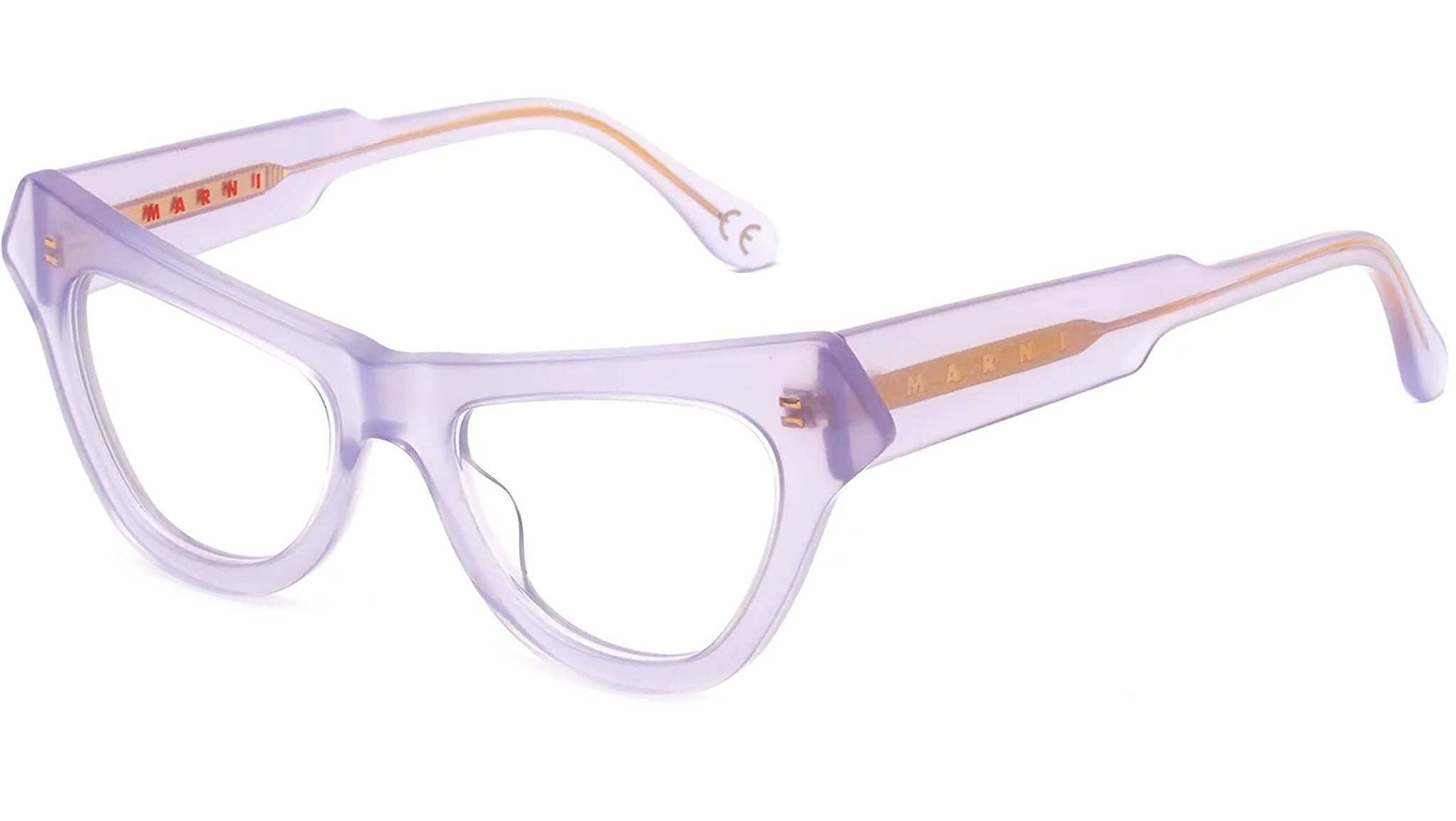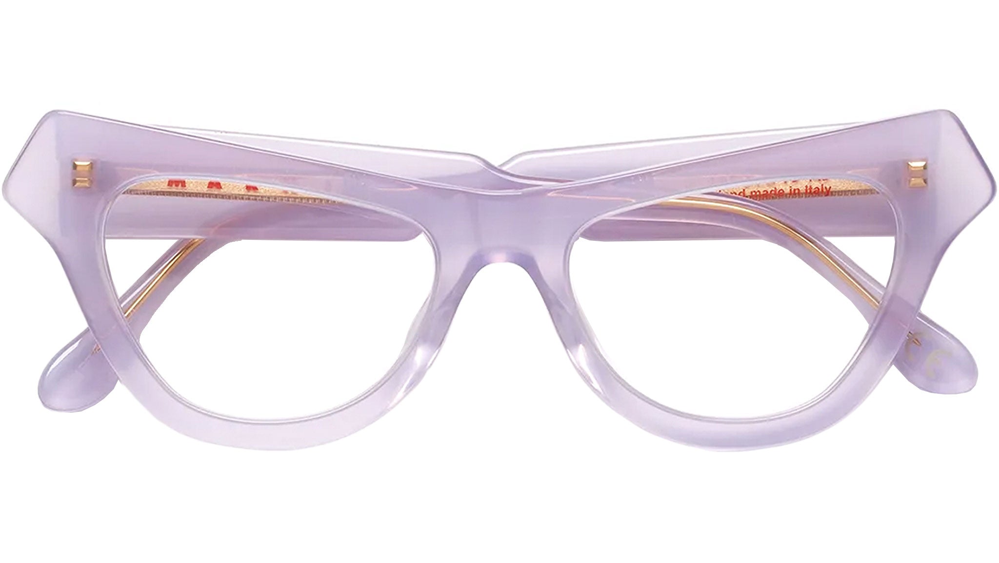 Designed exclusively for Marni, Jeju Island is a bold Optical frame characterized by a chunky acetate construction and sculpted rims. The model is a unique reinterpretation of cat-eye shapes, with triangular lenses and a pointed front. The unique v-shaped browline is matched by softly curved lenses. This version features a playful purple-tinted acetate