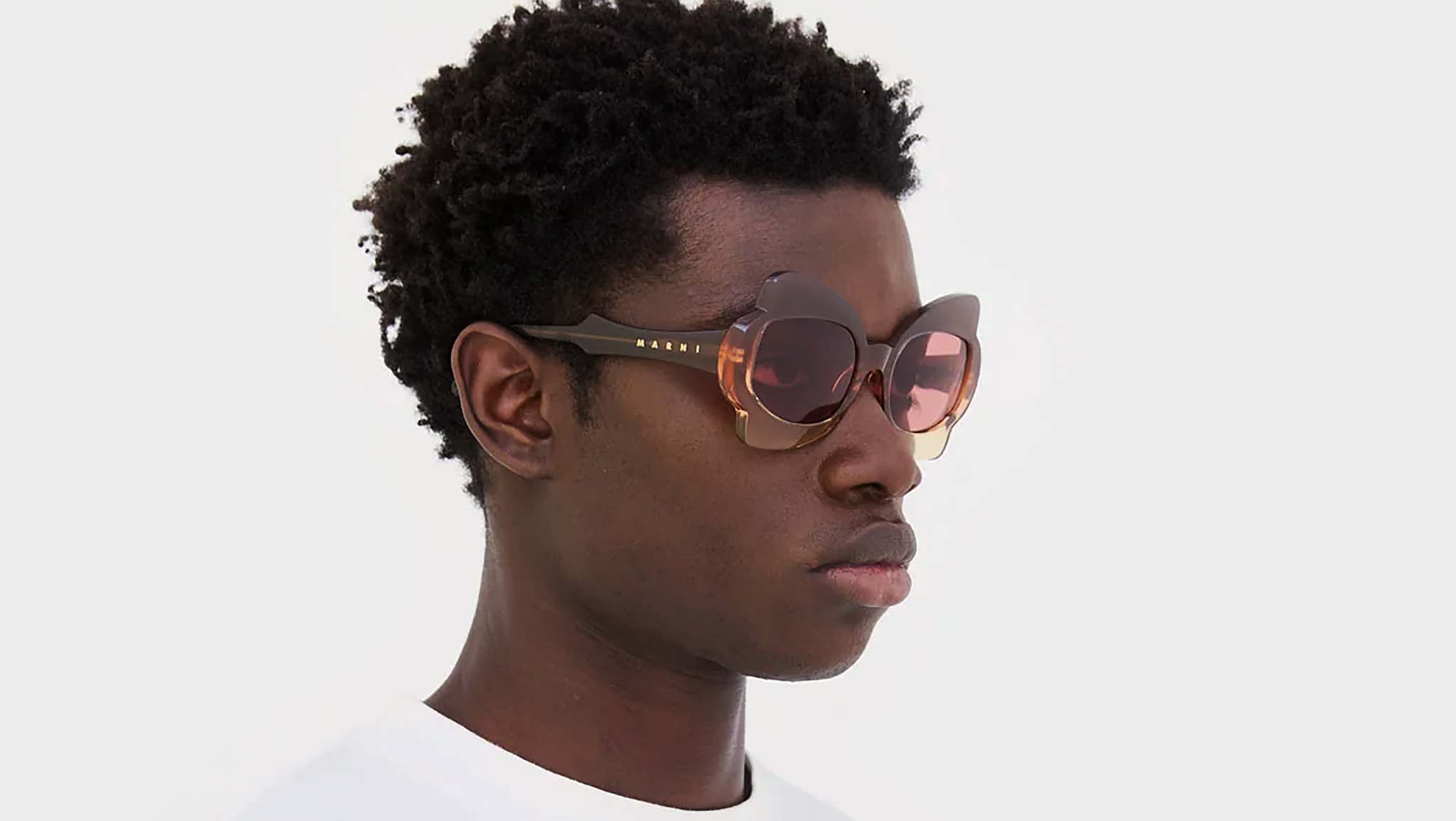Designed exclusively for Marni, Monumental Gate is a playful silhouette inspired by floral references. Its bold acetate construction features thick, curved rims that have been milled to form a rounded, bulky design. Unique temples complement the frontal piece with a sculptural pointed element carrying a laser engraved Marni logo. This version features a sophisticated fading brown, pink and ochre acetate and Bordeaux tinted lenses with gold decors. Sizes: R Lens Width: 56 mm. Frame Front: Frame Side: 145 mm. Product Code Size R: H29