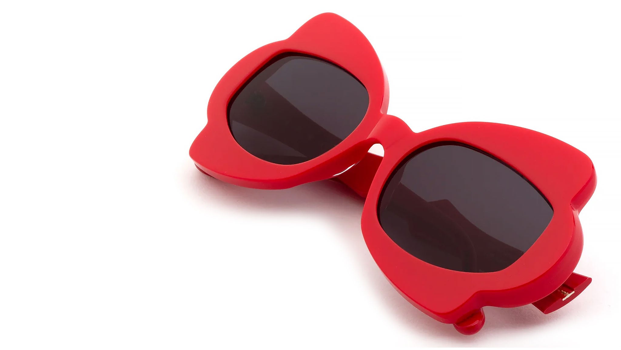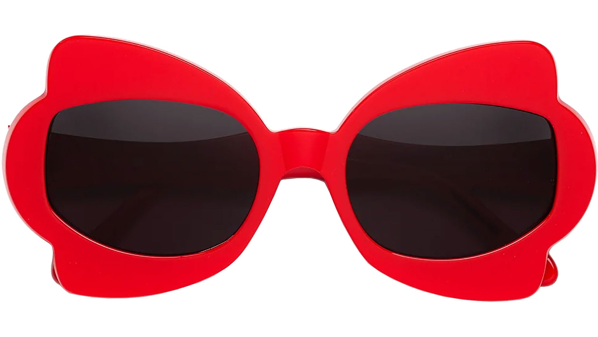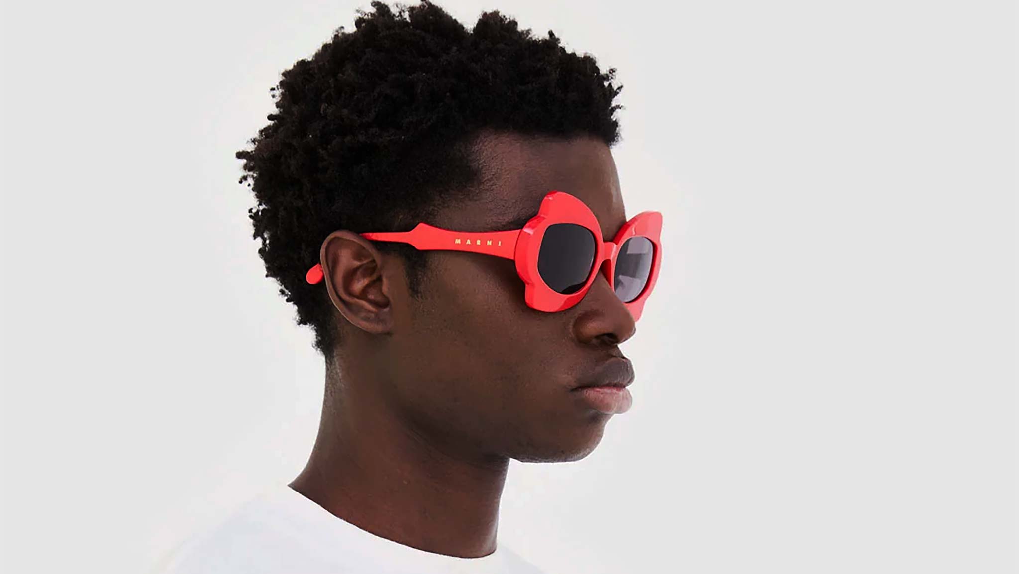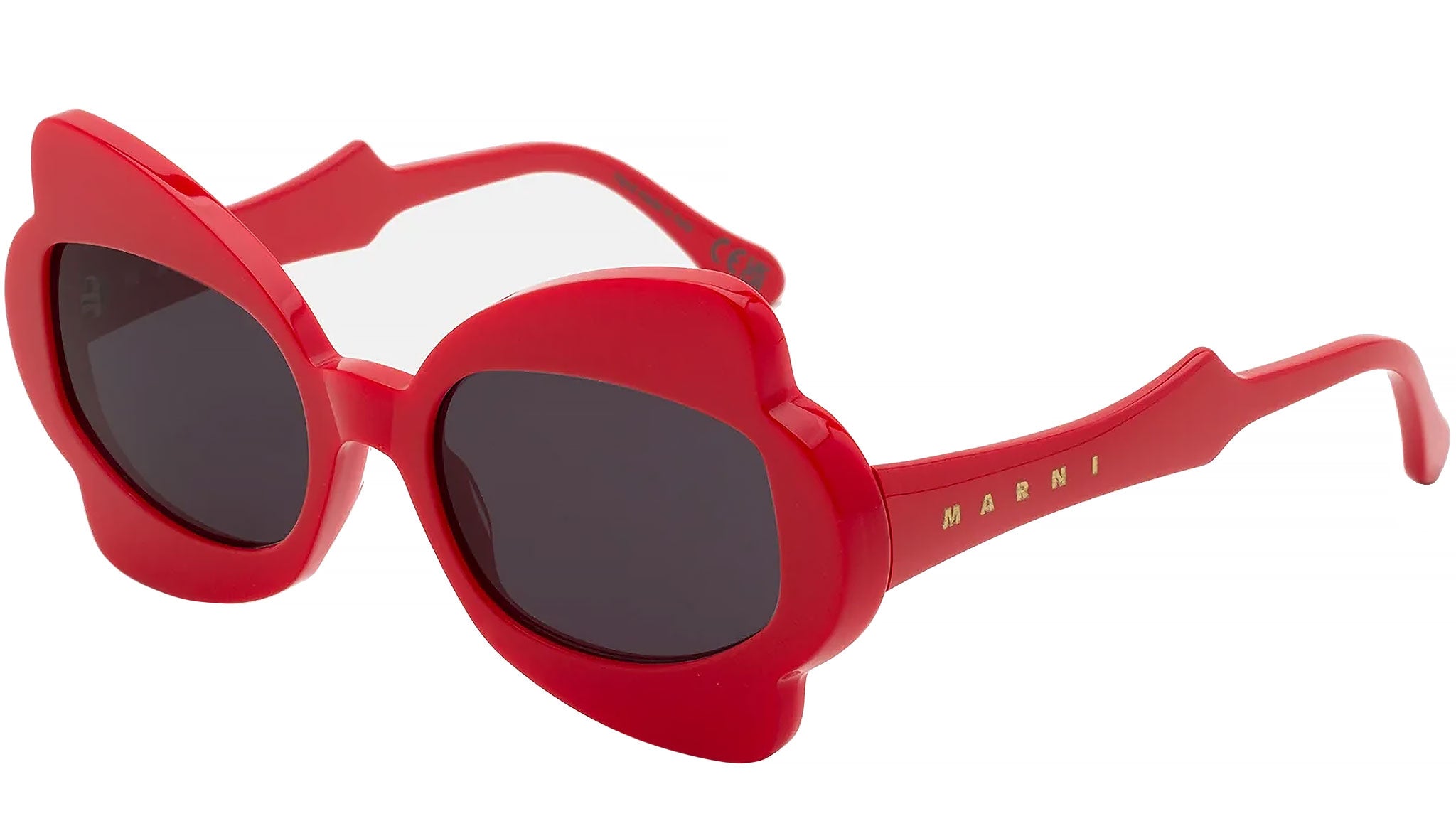 Designed exclusively for Marni, Monumental Gate is a playful silhouette inspired by floral references. Its bold acetate construction features thick, curved rims that have been milled to form a rounded, bulky design. Unique temples complement the frontal piece with a sculptural pointed element carrying a laser engraved Marni logo. This version features a punchy red acetate and black lenses with gold decors. Sizes: R Lens Width: 56 mm. Frame Front: Frame Side: 145 mm. Product Code Size R: XJB