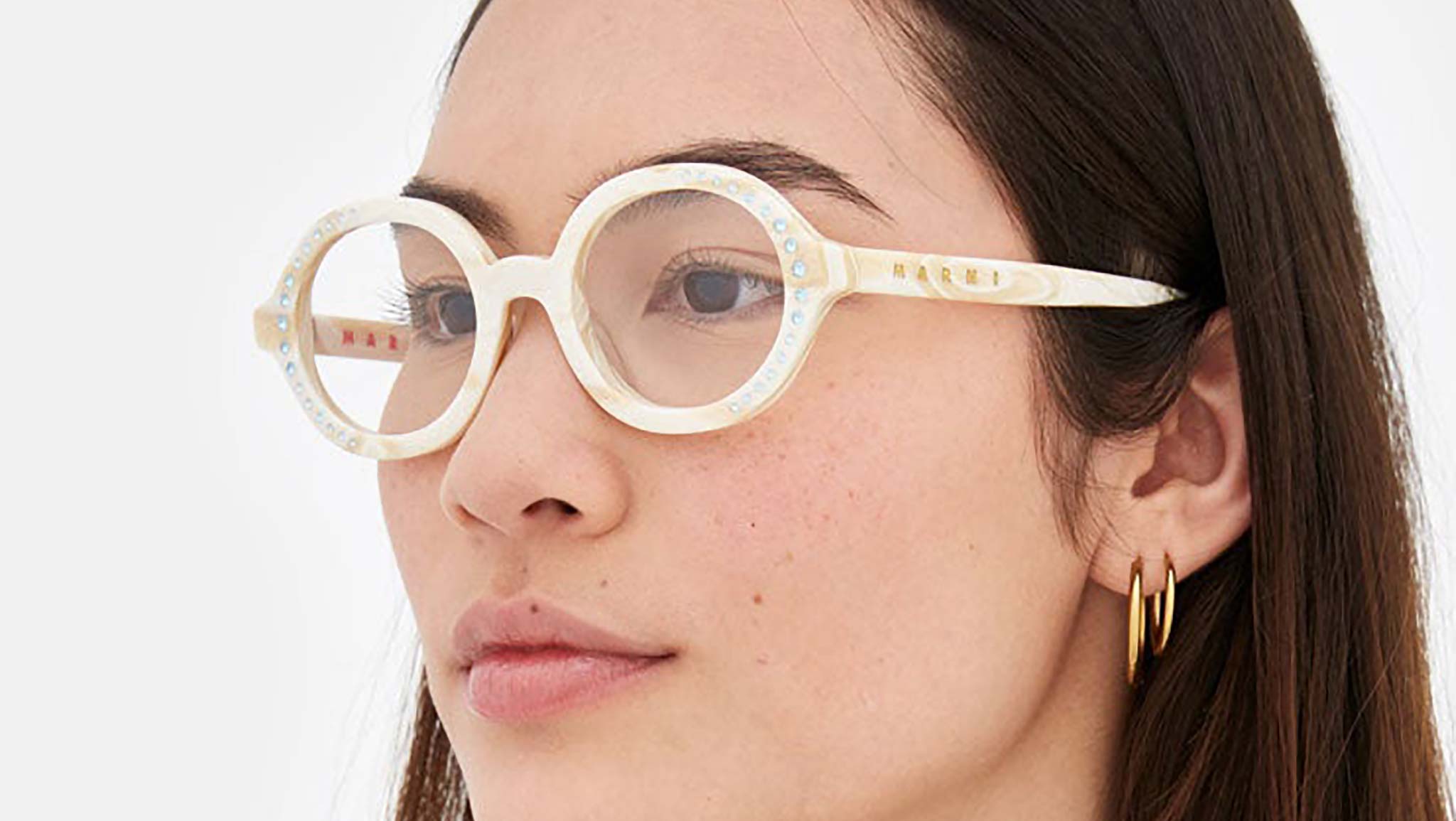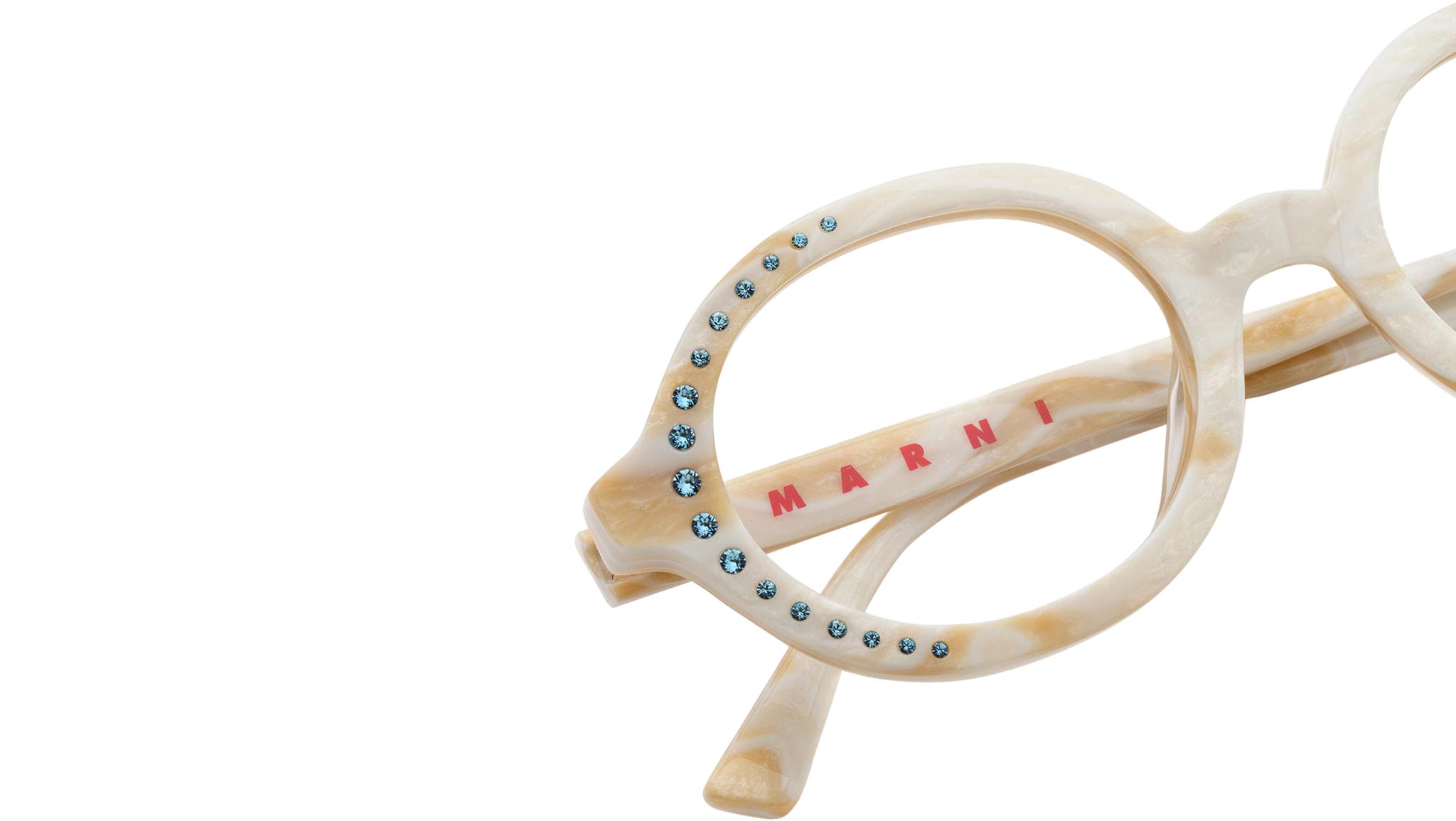 Designed exclusively for Marni, this Optical version of Nakagin Tower silhouette proposes a fresh and playful interpretation of timeless rounded shapes. The model’s geometric curves have been slightly flattened to form an ovaloid design, with sturdy rims featuring encased precious stones. This is a model that celebrates exceptional craftsmanship of the Made in Italy design. Nakagin Tower is available in a creamy pearly white acetate. Sizes: R Lens Width: 51 mm. Frame Front: Frame Side: 145 mm. Product Code Size R: 8CJ
