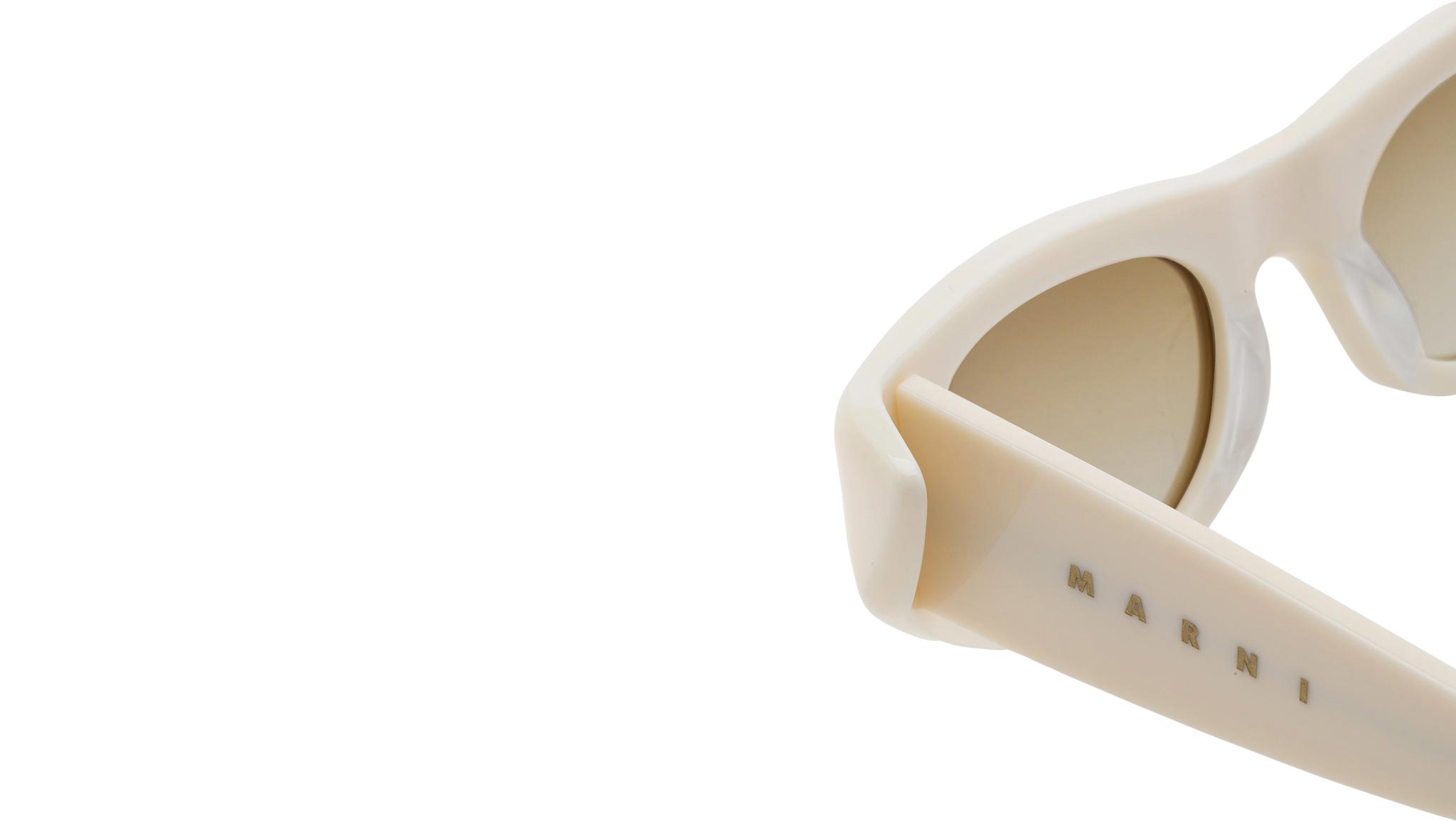 Designed exclusively for Marni, Netherworld is a bold frame characterised by sharp angles and precise geometries. The model features slanted lenses encased within thick acetate rims, curved around the temples to form a triangular décor on the sides. Thick acetate temples match the overall compact, sturdy and slightly serious character of the frame. This version comes in a creamy off-white acetate with matching lightly tinted lenses and gold detailing. Sizes: R / R Lens Width: 53 mm. Frame Front: Frame Side: 145 mm. Product Code Size R: 8FP Product Code Size R: 2M0