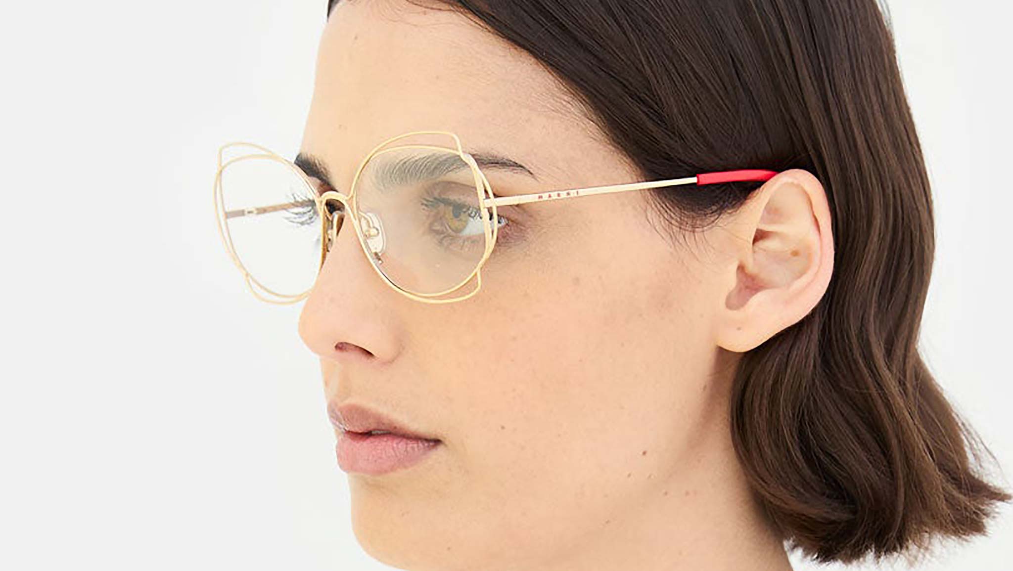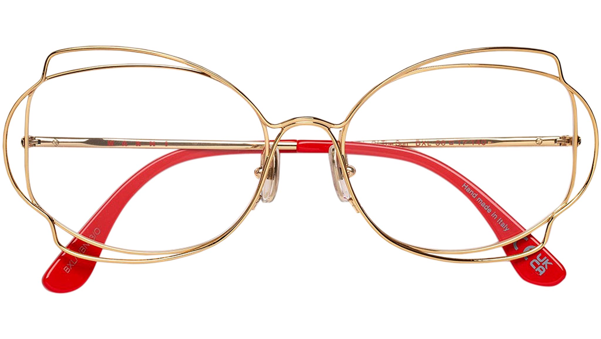 Designed exclusively for Marni, Route of the Sun is a playful optical frame inspired by Art Deco references. The silhouette features an all-metal construction with decorative metal wire encasing its oval lenses and forming an abstract floral shape. Sleek temples with acetate tips complete this unique lightweight frame that comes in a gold finish with red acetate detailing. Sizes: R Lens Width: 58 mm. Frame Front: Frame Side: 135 mm. Product Code Size R: BXL