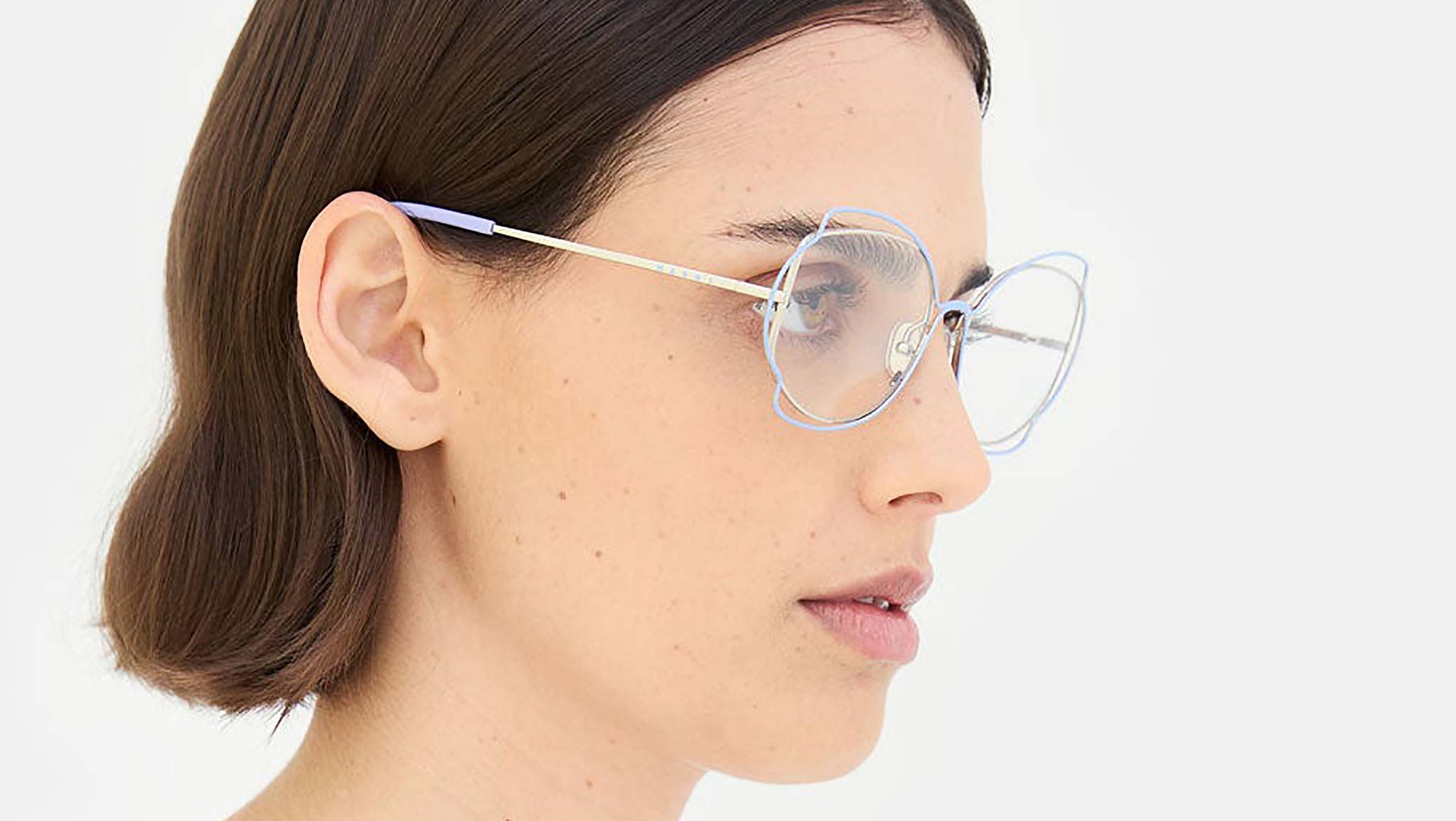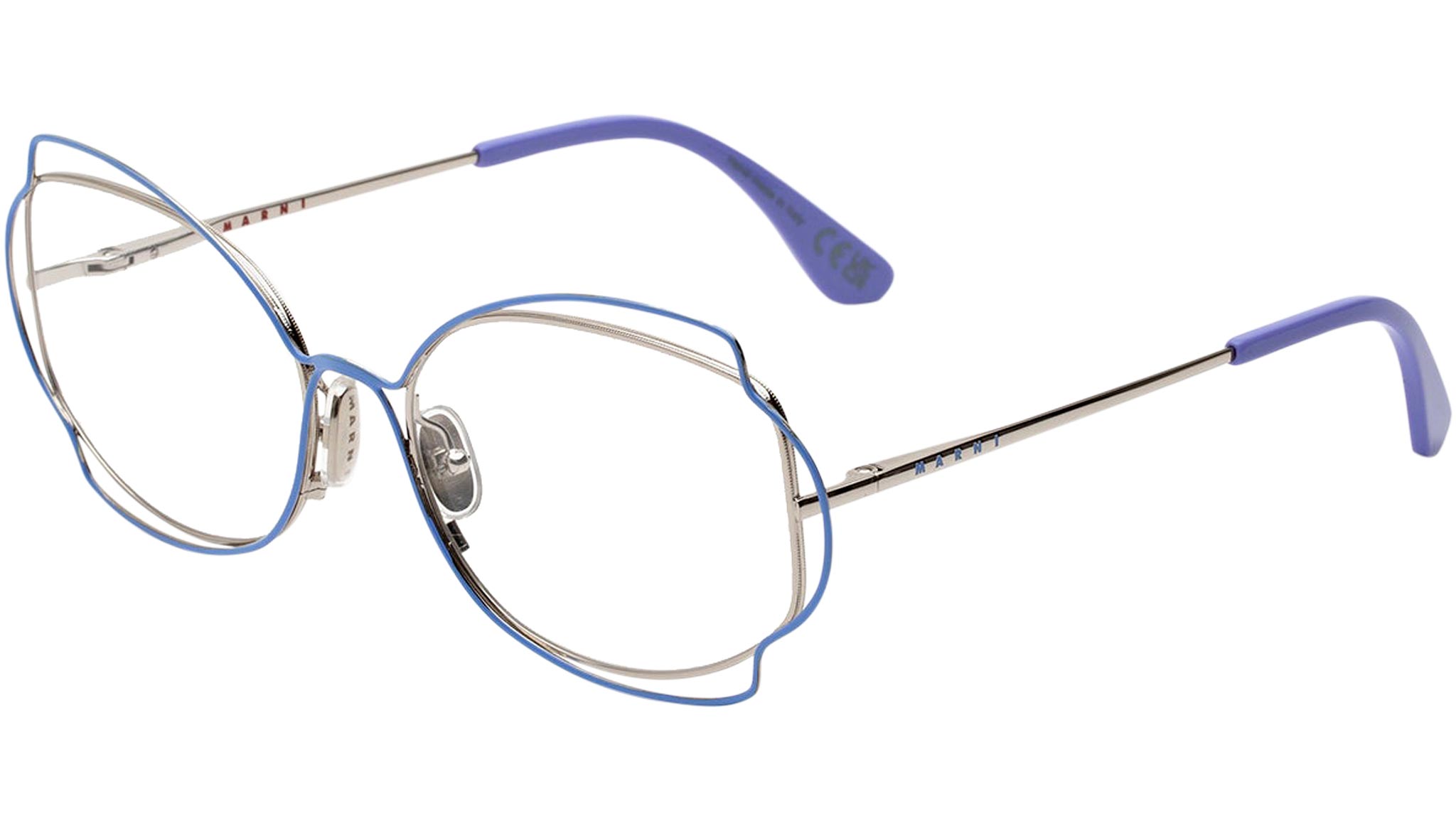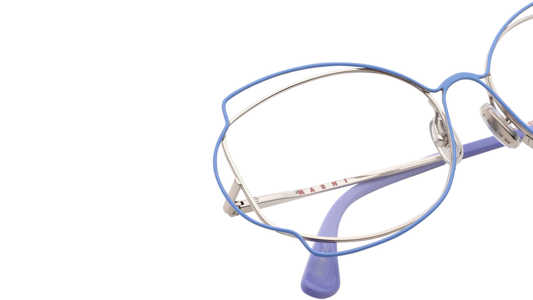 Designed exclusively for Marni, Route of the Sun is a playful optical frame inspired by Art Deco references. The silhouette features an all-metal construction with decorative metal wire encasing its oval lenses and forming an abstract floral shape. Sleek temples with acetate tips complete this unique lightweight frame that comes in a lilac and silver finish with lilac acetate detailing. Sizes: R Lens Width: 58 mm. Frame Front: Frame Side: 135 mm. Product Code Size R: RE0