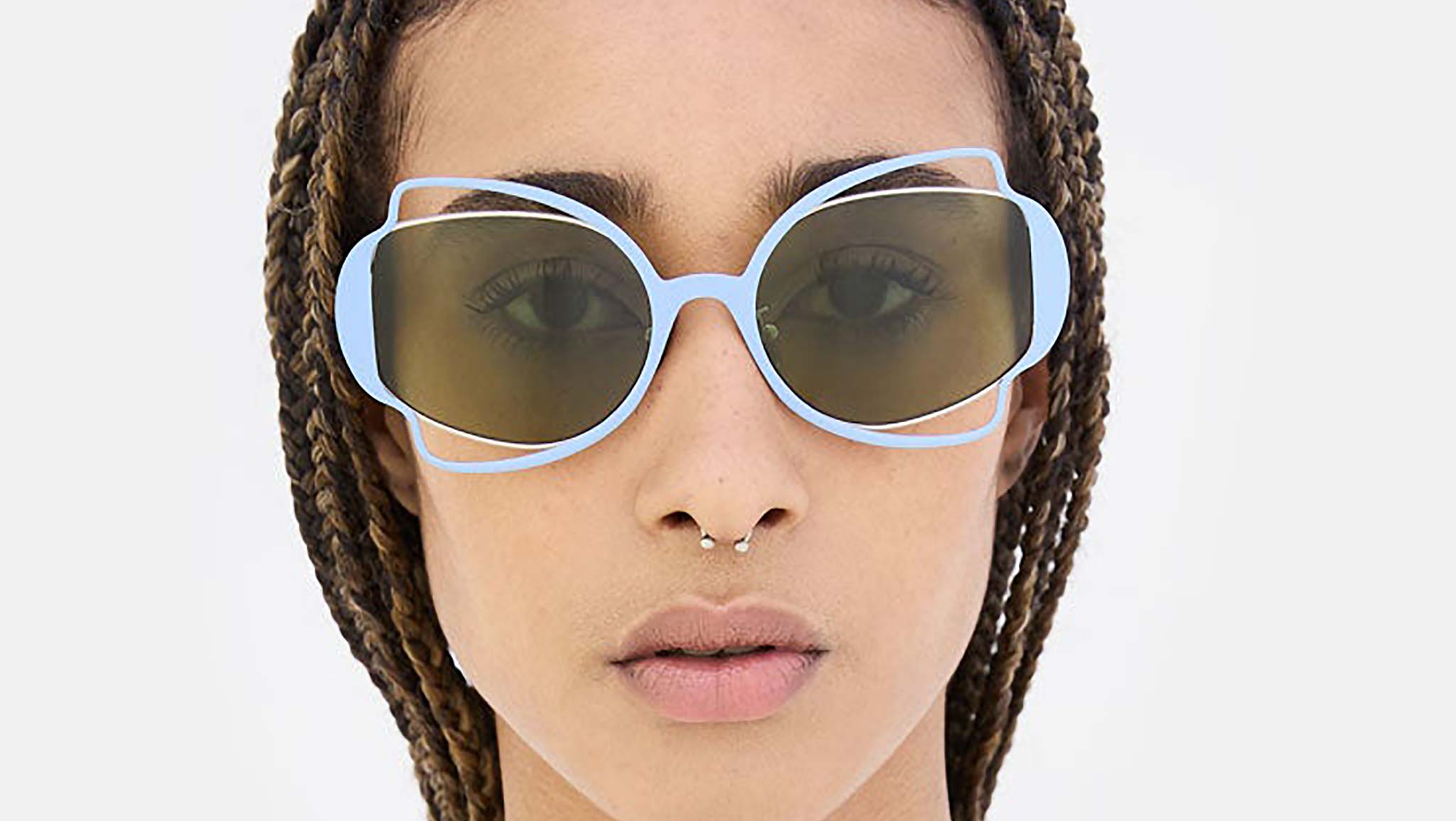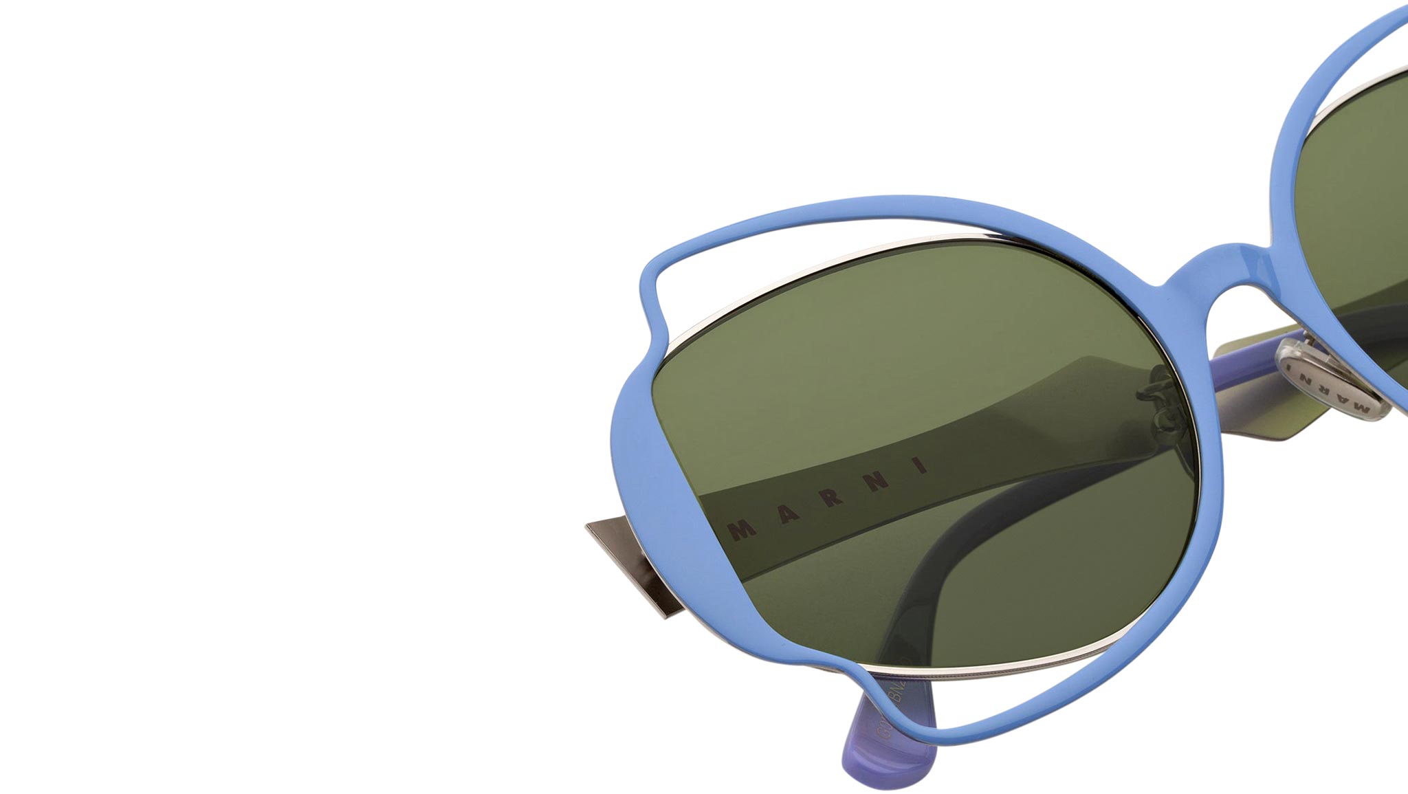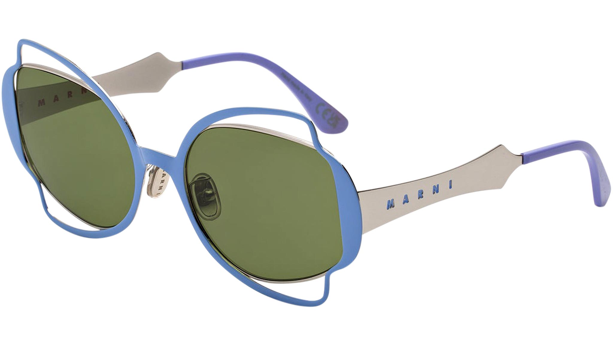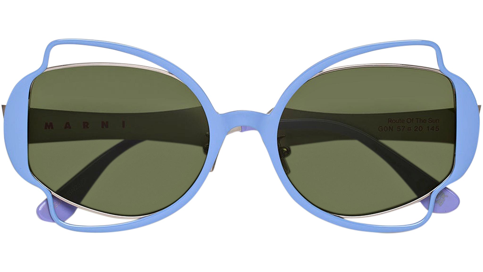 Designed exclusively for Marni, Route of the Sun is a playful oversized shape that features an elaborate metal construction. A thin sheet of metal has been cut to form a decorative silhouette, referencing floral, Art Deco pieces, on both the front and temples. Perforated detailing around the lenses gives this silhouette its distinctive character, with acetate temple tips added for comfort. The model comes with a hand-painted lilac metal finish and matching acetate tips, with green lenses. Sizes: R Lens Width: 60 mm. Frame Front: Frame Side: 130 mm. Product Code Size R: G0N