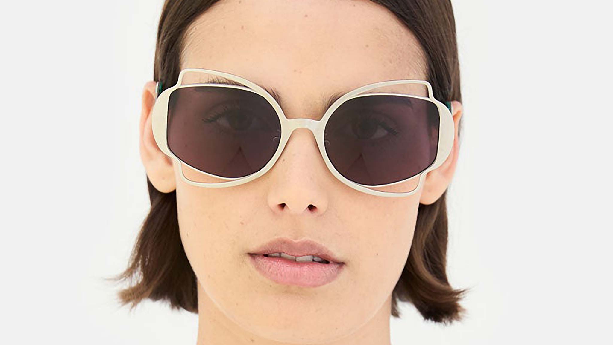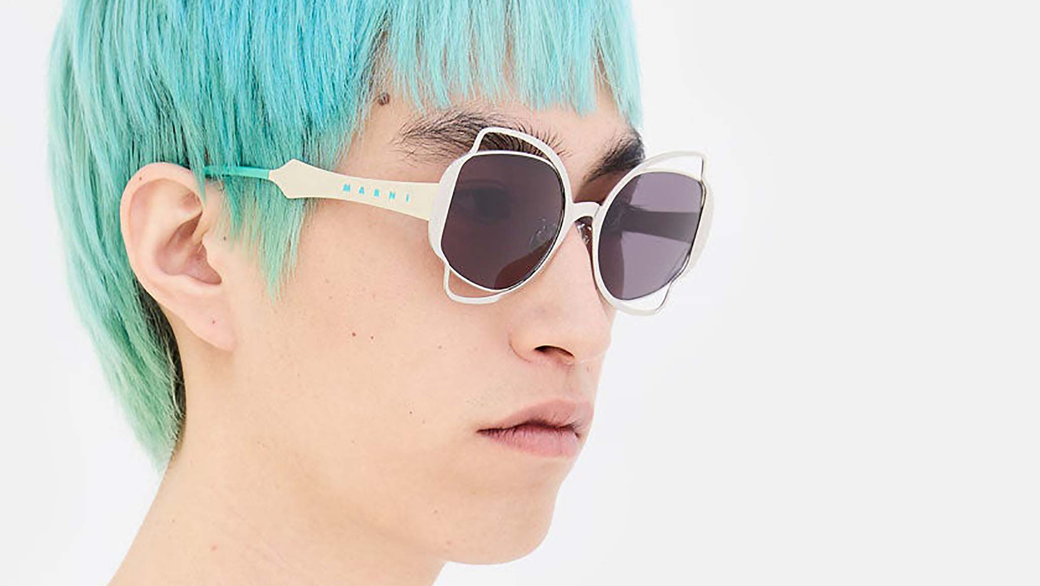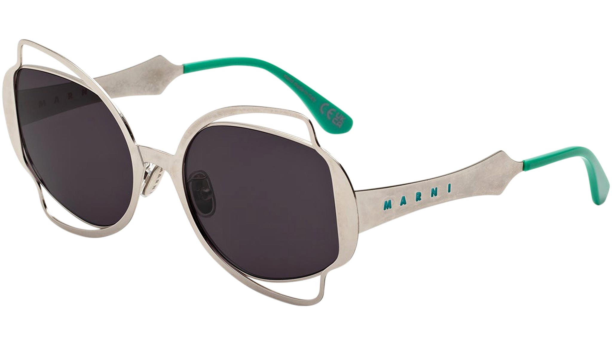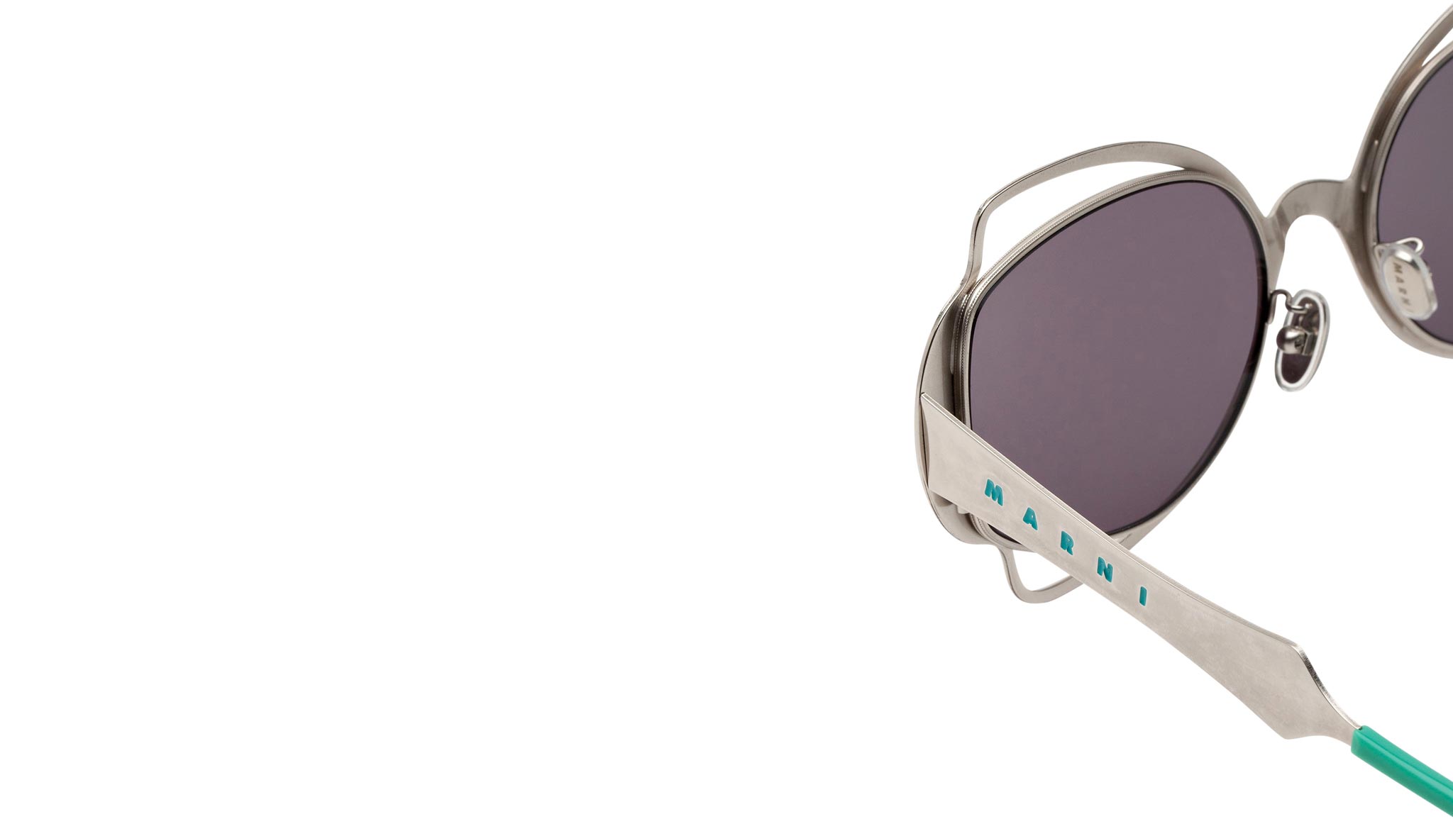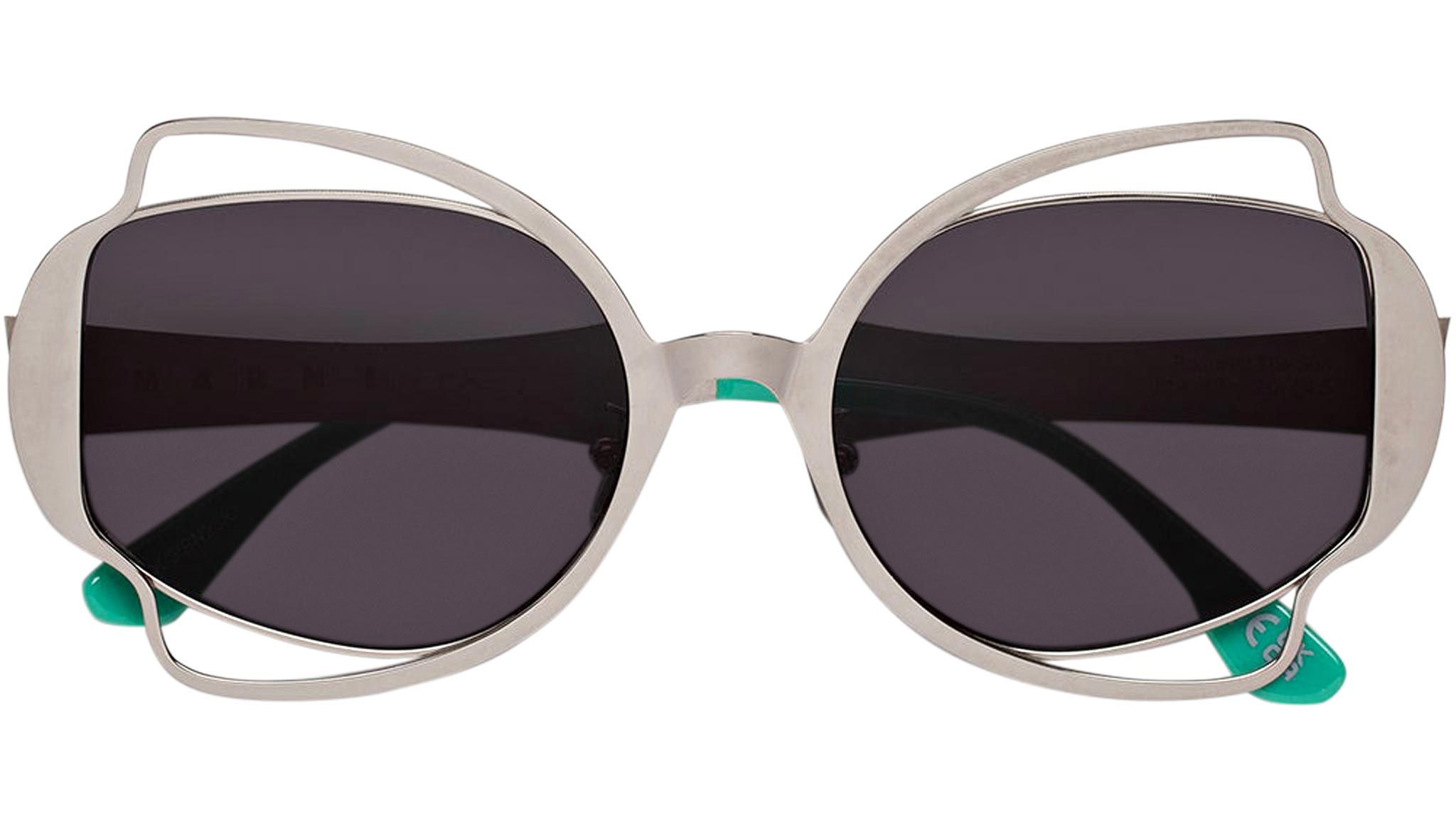 Designed exclusively for Marni, Route of the Sun is a playful oversized shape that features an elaborate metal construction. A thin sheet of metal has been cut to form a decorative silhouette, referencing floral, Art Deco pieces, on both the front and temples. Perforated detailing around the lenses gives this silhouette its distinctive character, with acetate temple tips added for comfort. The model comes in a sleek silver metal finish, teal acetate and smoky black lenses. Sizes: R Lens Width: 60 mm. Frame Front: Frame Side: 130 mm. Product Code Size R: J2K